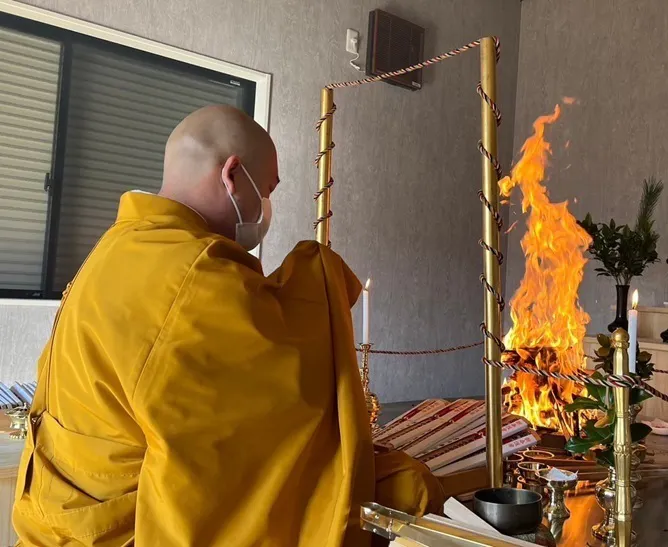 毎月28日の不動明王護摩供にて1年間ご祈祷をいたします。護摩札は2体お作りいたします。初めの28日にご祈祷後、1体はお手元にお送りいたします。もう1体は毎月28日、1年間ご祈祷をさせていただき1年後にお手元にお送りいたします。護摩供の日以外は本堂にて不動明王さまの宝前にてご祈念いたします。