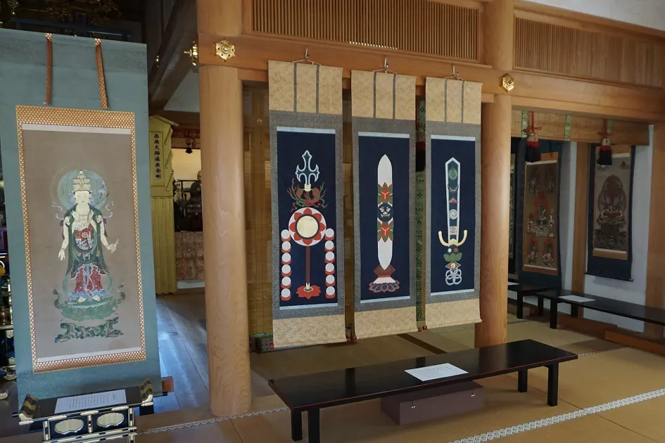 修復された仏さまを中心に、年に2回特別展にて公開しています。真ん中は修復された三種神器図です。今回修復されるお仏画も、完了後は特別展にて公開してまいります。