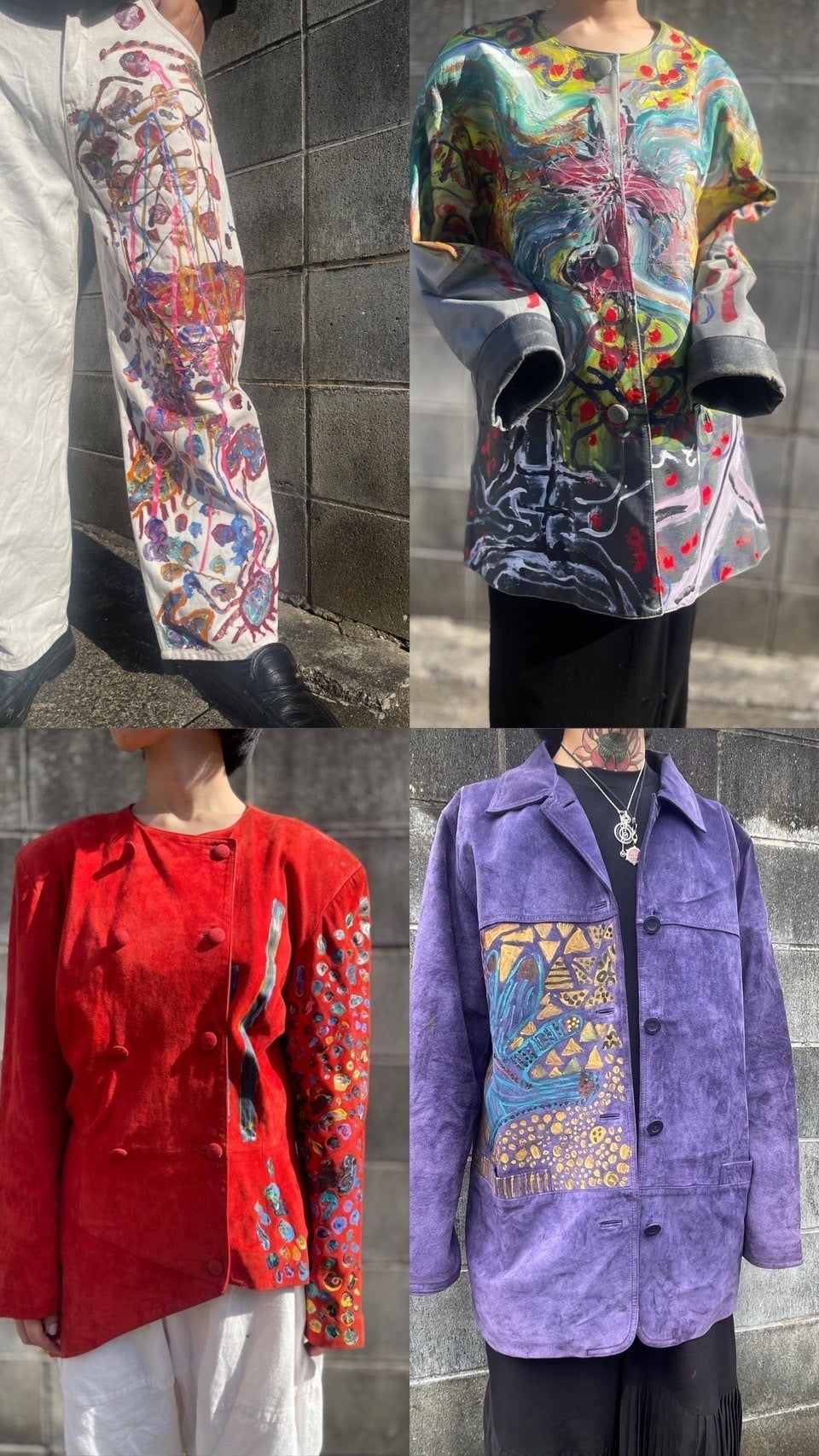 主に、制作している商品は、アクリル絵の具でキャンバスに絵を描き、無地の古着や、ビンテージの洋服にペイントしています。