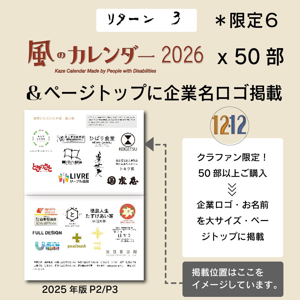 リターン 2 「風のカレンダー2026」x 10部以上ご購入 & 【企業ロゴ掲載】 ¥16,500