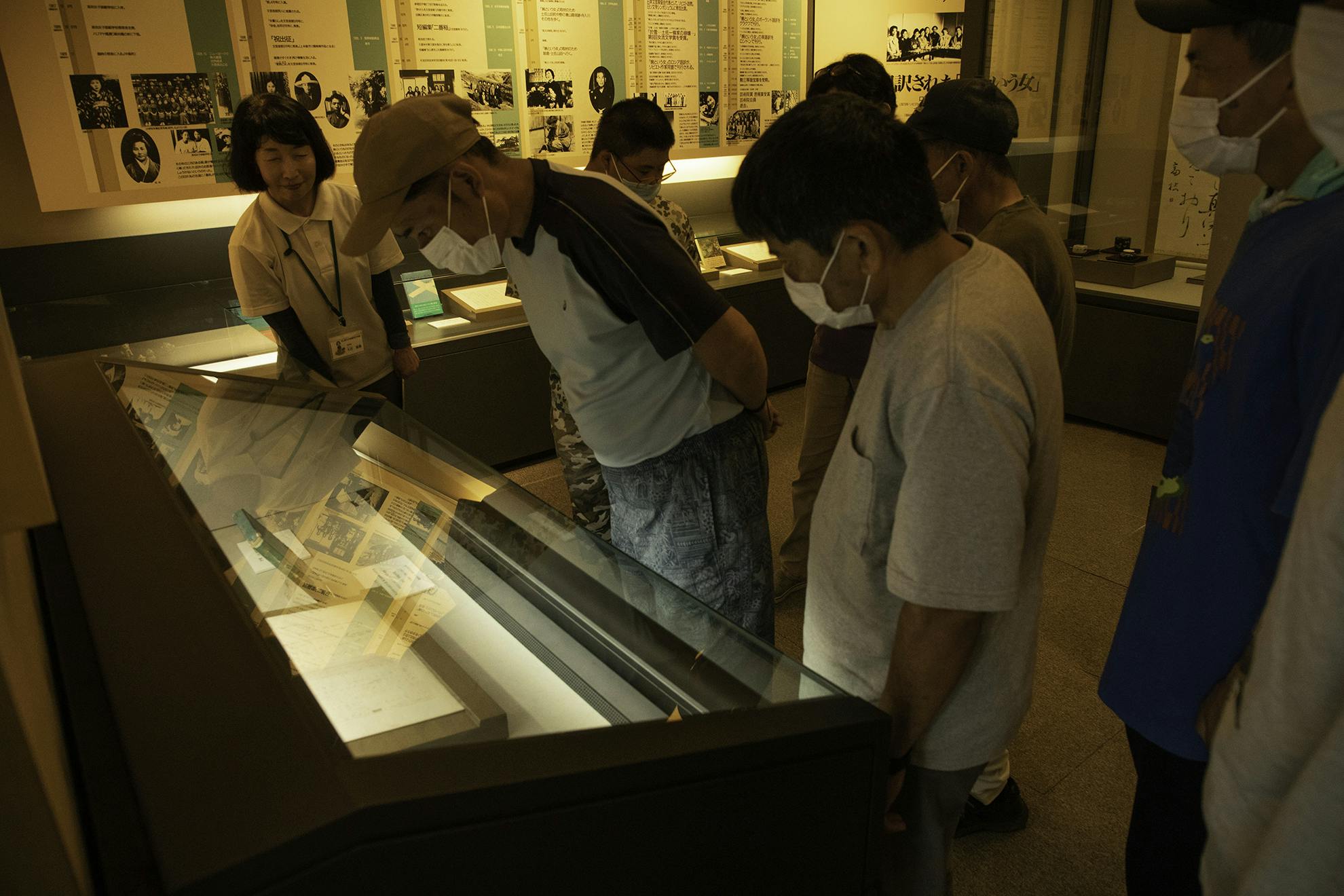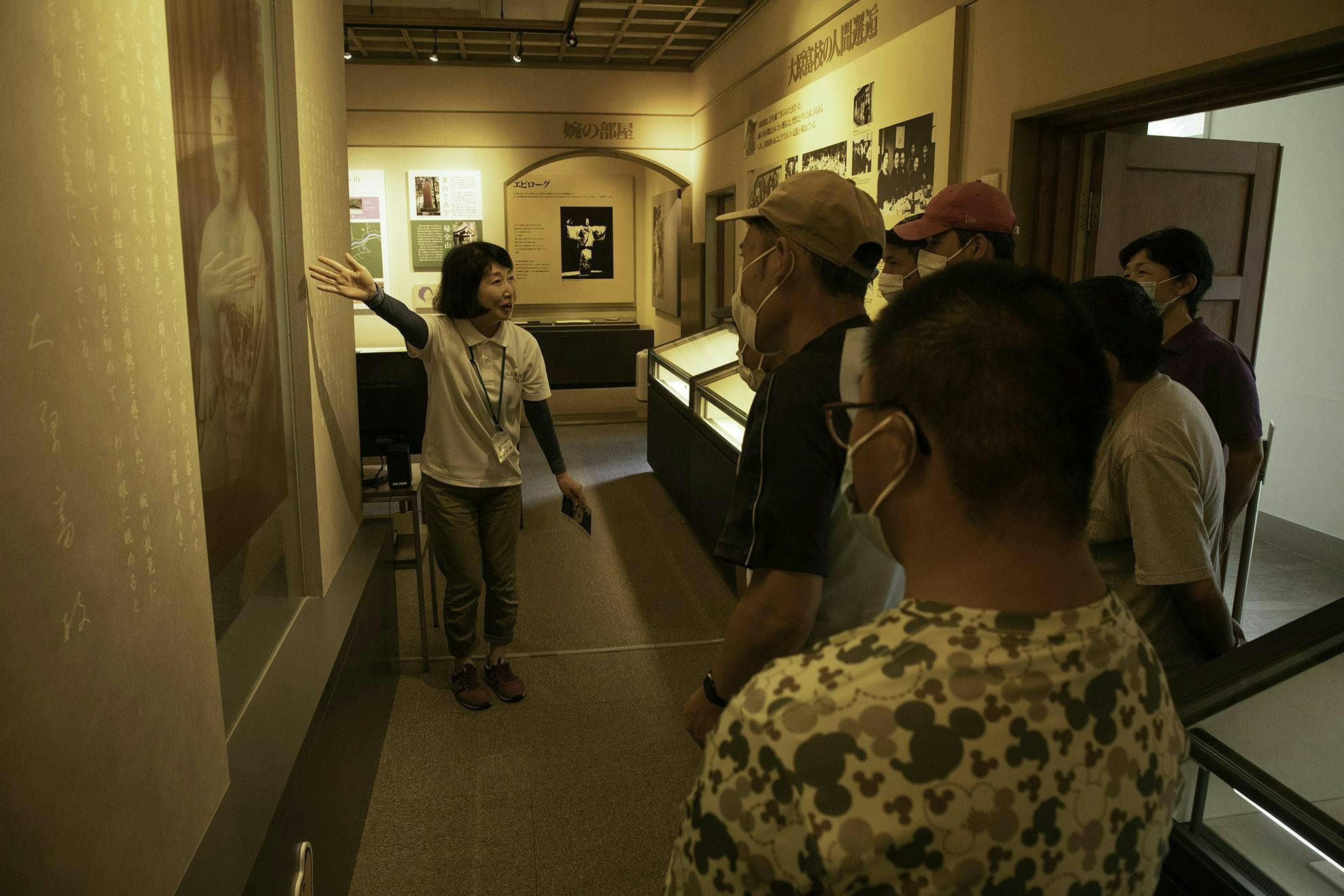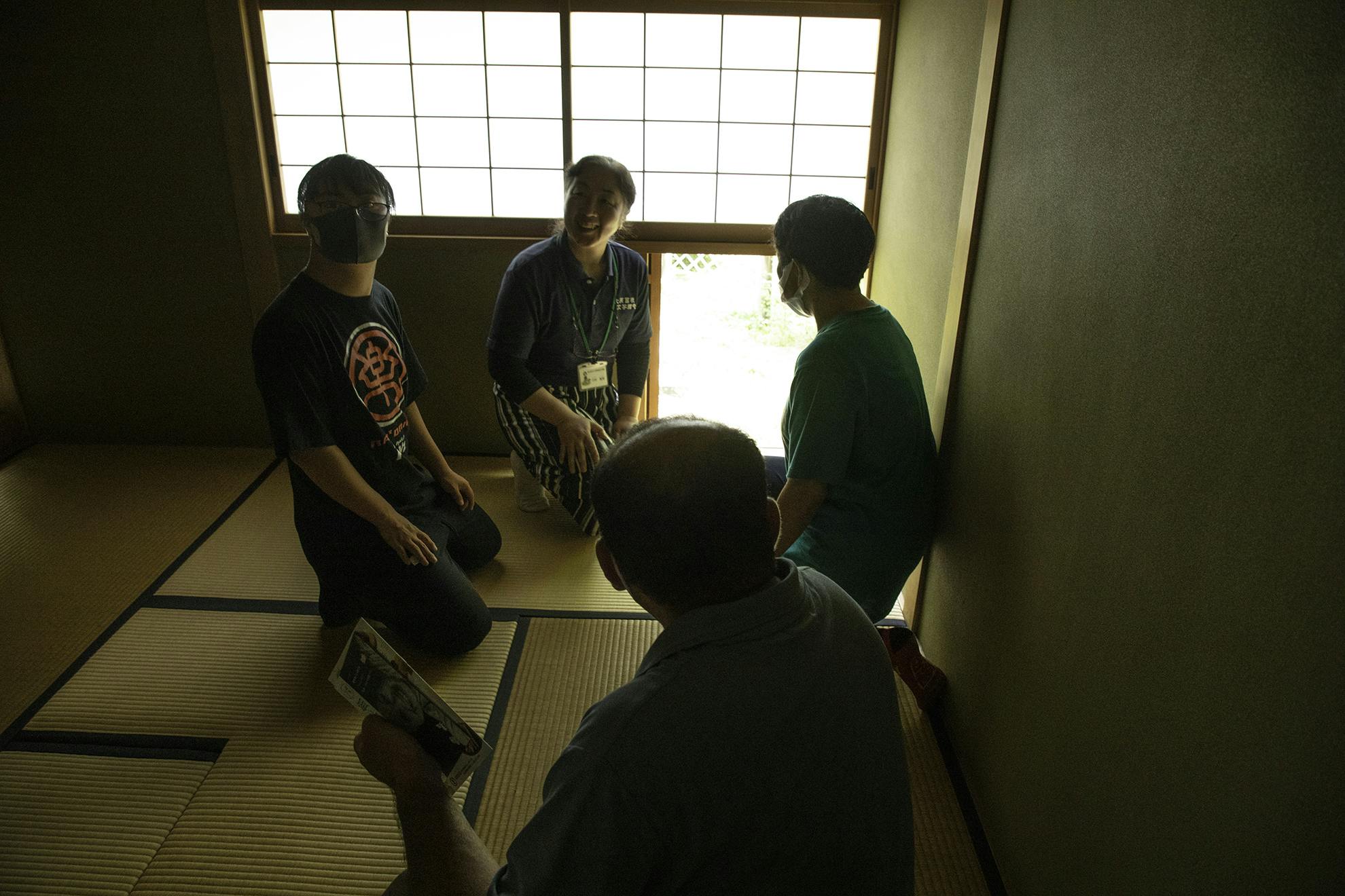 文学館職員の大石さん、川村さんのお二人に熱のこもった解説をしていただきながら、館を回ります。大原富枝さんの書斎や茶室を移設した展示には皆さん興味津々でした。