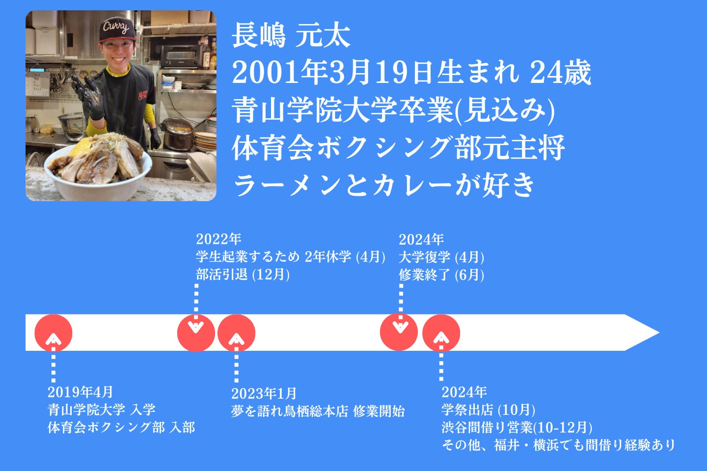 1年間休学をして佐賀県にある「夢を語れ鳥栖総本店」で、2023年1月から2024年6月までの約1年半の修業をしました。その後は大学に通いながら、当時一緒に修業していた仲間の出店の立ち上げや、母校の学祭に出店したり、2024年10月から12月まで毎週月曜に渋谷で間借り営業をしました。ありがたいことに、毎回多くのお客様にご来店いただき、支えられながら営業を続けることができました。また修業先でもカレーライスや汁なしにキーマカレーかけた限定メニューなどを販売していました。ありがたい事に毎度お客さんから好評を頂いていました。ラーメンとカレーという二つの分野で、自分の好きをカタチ(形)にし、多くの方に楽しんでいただけるよう努めています。