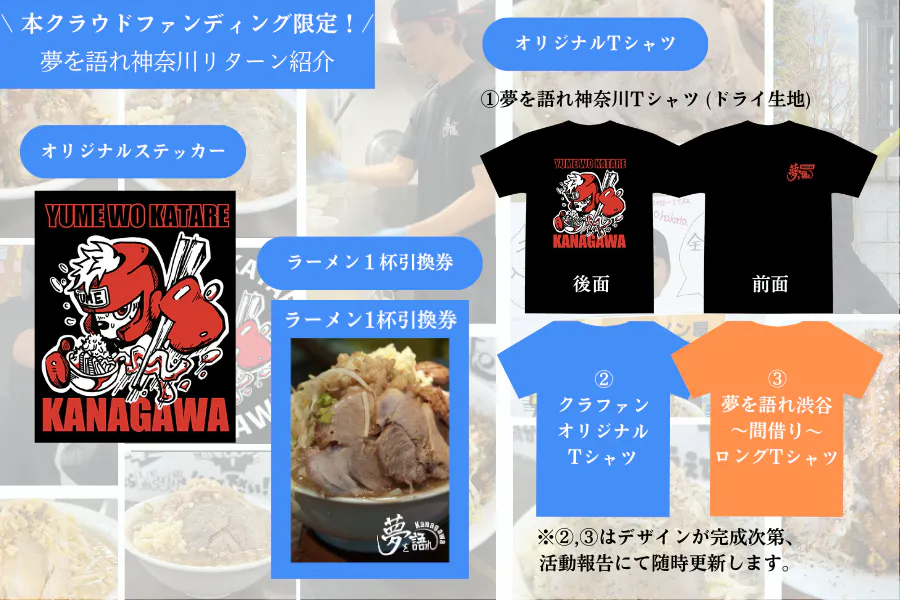 今回のクラウドファンディングでは、リターンとして、ラーメンの無料券のご提供はもちろん、