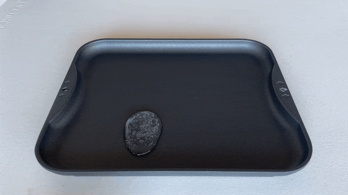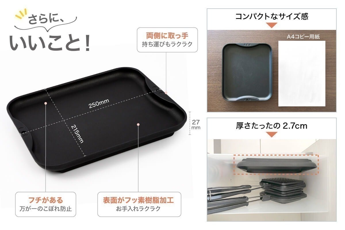 A.表面にフッ素樹脂加工を施し、汚れを落としやすくしました。軽く洗うだけの簡単お手入れです。