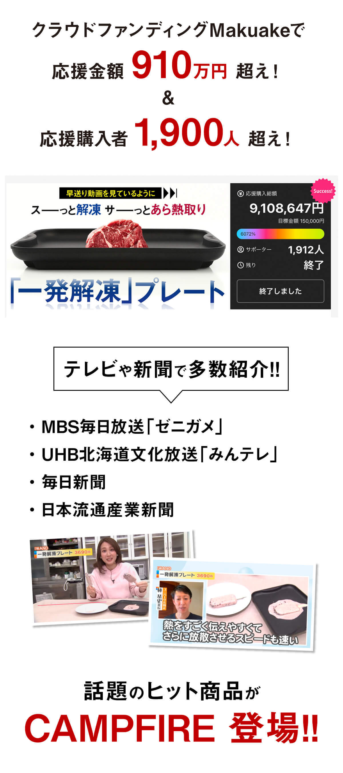 2025/09/18 11:00応援してくださっている皆様へ明日9/19(金)am11:00 新プロジェクトが始まります!\トースターだけで憧れの土鍋ごはん/火加減不要のほったらかし炊飯で、特別を日常に『IWANO 感動おひつ』クラウドファンディングMakuakeでは、応援金額6,400,000円を突破!!TBS「がっちりマンデー!!」でも取り上げられた話題のヒット商品がCAMPFIRE登場。そしてプロジェクトスタート限定の10%OFFクーポンを発行します!有効期限は9/23まで!最安リターンは限定20個ですので、気になる方はどうぞお早めにお買い求めください。********************クーポンでお得に購入はこちらから!******************** もっと見る【御礼】プロジェクト終了のご報告とお礼