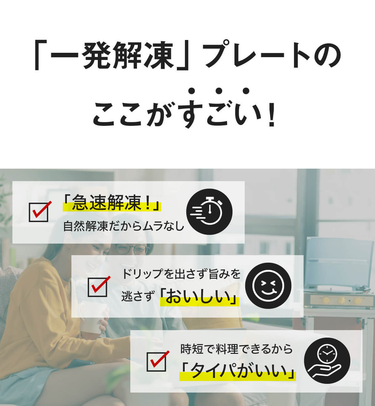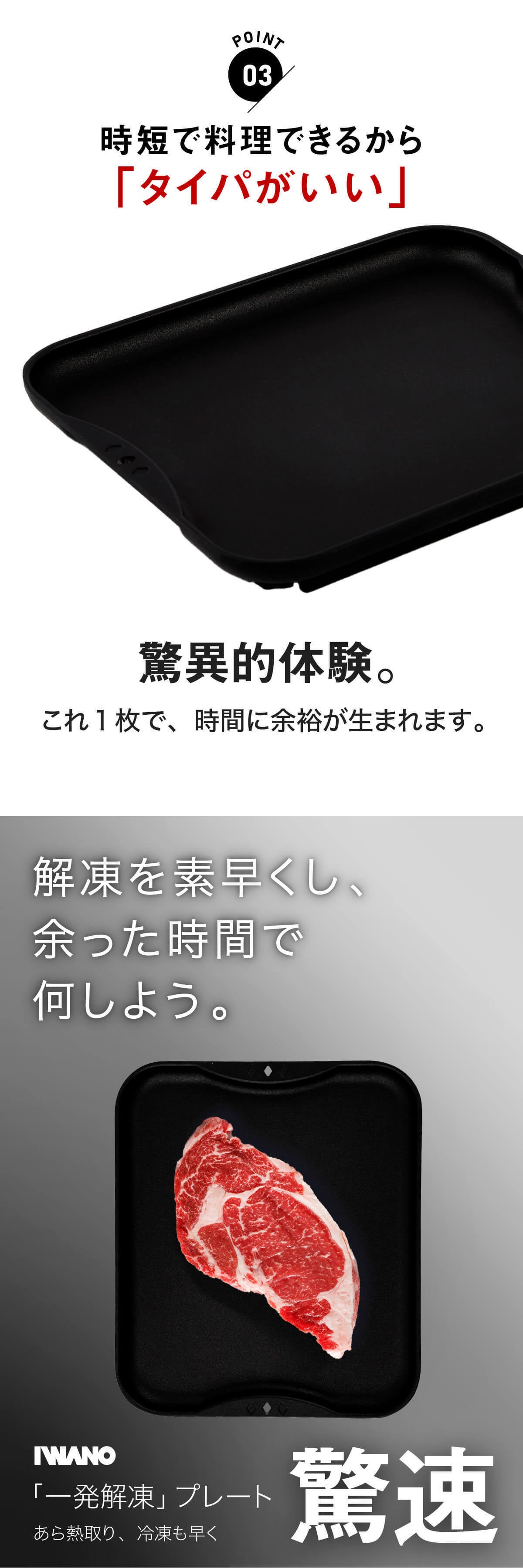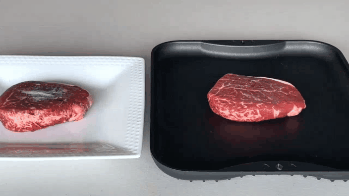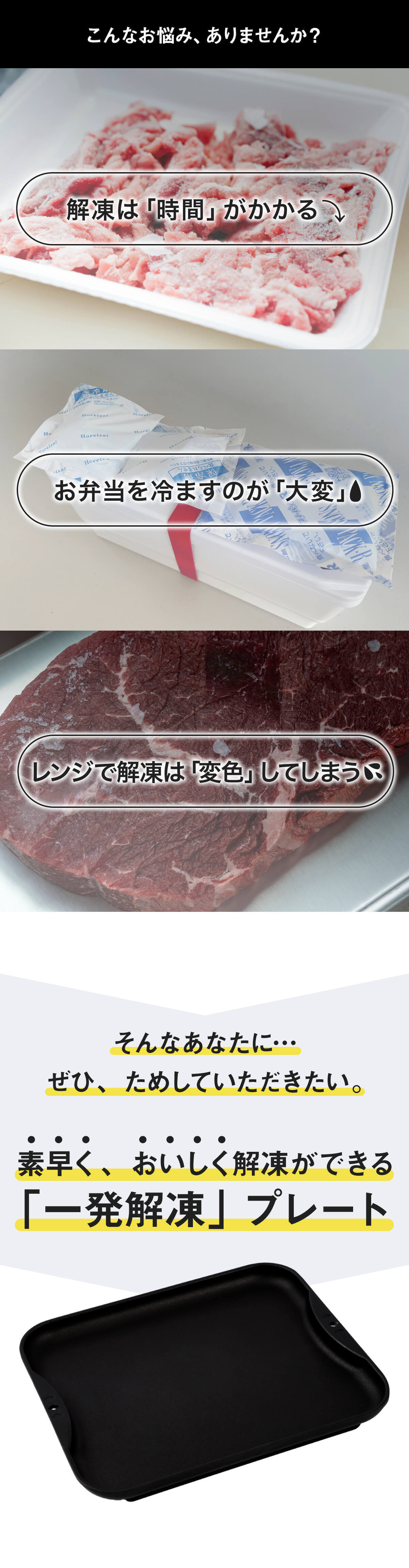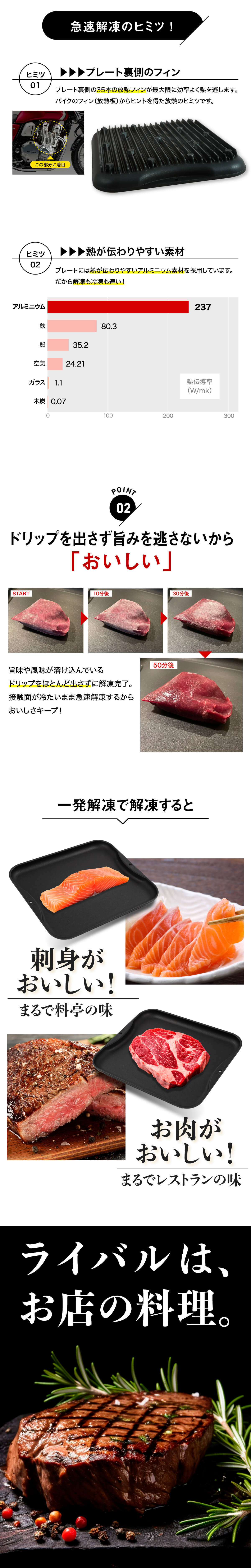 A.プレートに接触する面が大きく、室温が高いほど早く解凍します。分厚いお肉を解凍する際は、途中で裏返すと早く解凍できます。