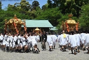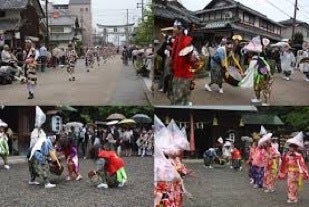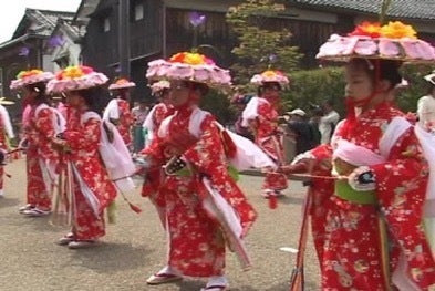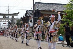 守山市杉江町、小津神社のケンケト祭りは例年5月5日に奉納され、小津、玉津の両地域11町が8年に1回の輪番制で踊りを披露します。約1500年前、欽明天皇(きんめいてんのう)の頃に琵琶湖のはんらんにより湖中へ流失した神霊を迎えた際、氏子らが踊りを奉納したのが、このまつりの始まりと伝えられています。