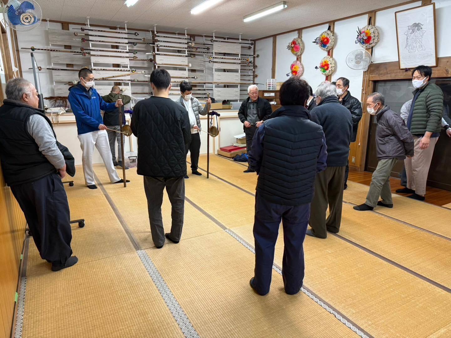 古式ゆかしい踊りの指導には古老も大活躍。長刀80人、太鼓2人、花笠8人、鉦6人、笛4人などの配置も前年のうちに決定し、3月の水・土曜日の夜間、4月は水・土曜日はもちろん、毎週日曜日の昼間にも練習します。