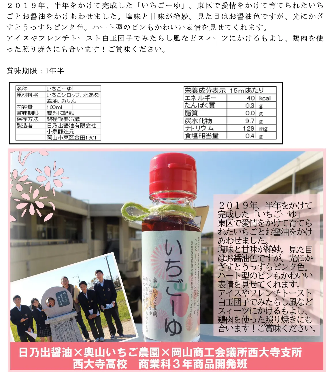 そして、このプロジェクトでは、全国各地の高校生と地域企業が作った商品をすべての人に届けることで、日本の食文化を守り、地域産業を盛り上げることを目的に活動しており、今回が初めの第一歩です。