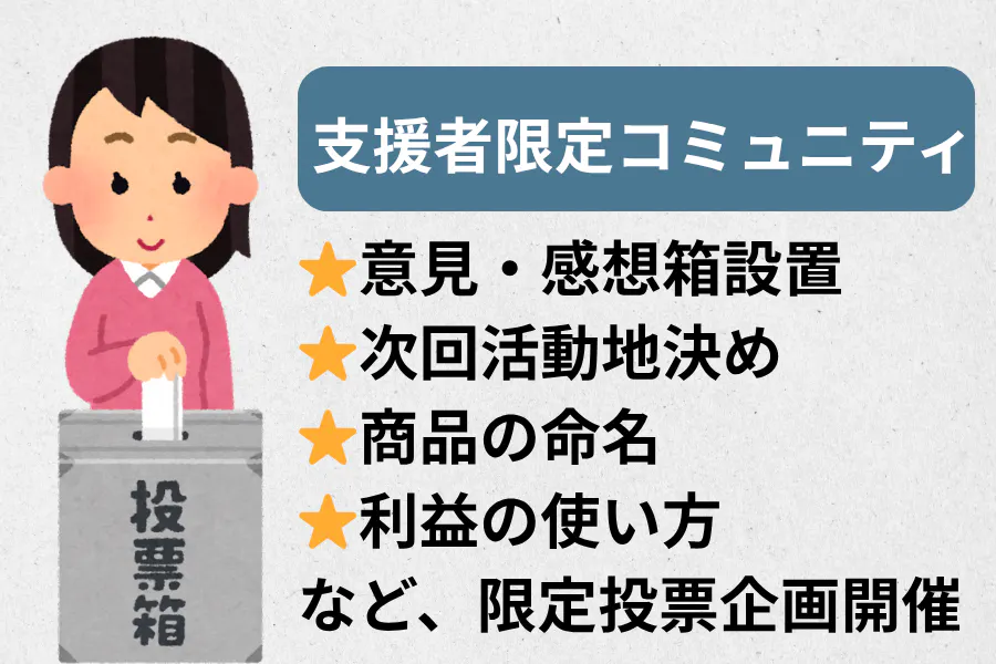 支援者限定コミュニティでは、アフターサービスのほかに、商品へのご意見や感想を募集します。次の活動地の選定や、集まった利益の使い道を決める投票企画も予定しています。
