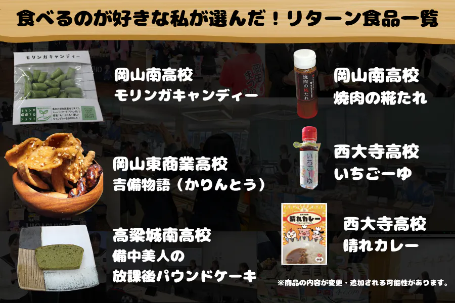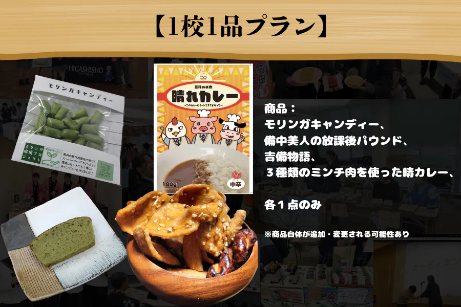 商品:モリンガキャンディー、備中美人の放課後パウンド、吉備物語、3種類のミンチ肉を使った晴カレー、焼肉の糀たれ、いちごーゆ各1点以上、
