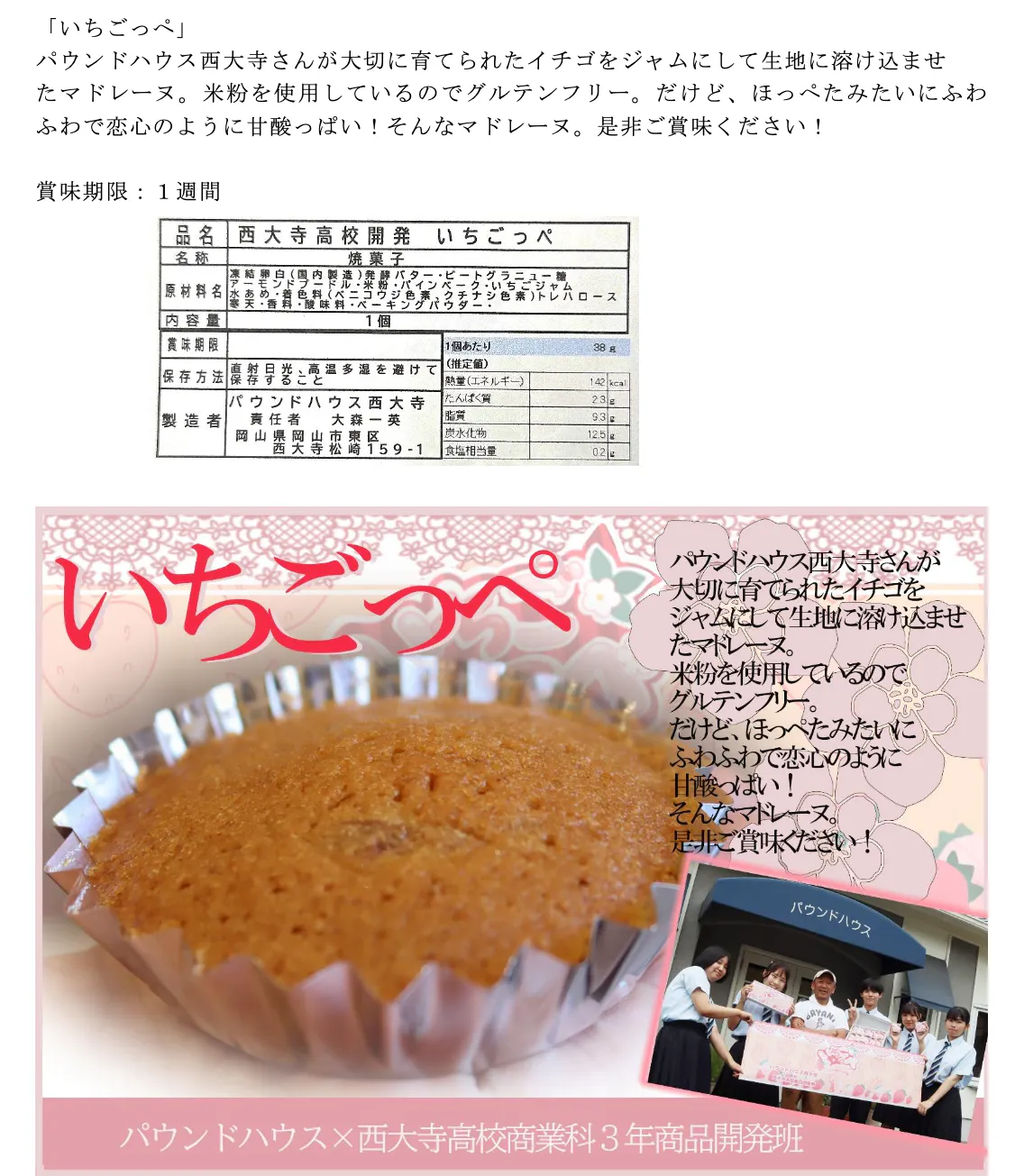 2026/01/26 18:29大変お世話になっております。【お菓子のみのプラン】のみ、西大寺高校様のいちごっぺという商品を追加しましたのでご報告します!いちごっぺの商品情報は以下のとおりです!名称:焼菓子原材料名:凍結卵白(国内製造)、発酵バター、ビートグラニュー糖、アーモンドプードル、米粉、パインベーク、いちごジャム、水あめ、着色料(ベニコウジ色素、クチナシ色素)トレハロース、香料、酸味料、ベーキングパウダー内容量:1個、賞味期限:2週間保存方法:直射日光、高温多湿を避けて保存すること製造者:パウンドハウス西大寺、責任者:大森 一英岡山県岡山市東区西大寺松崎159-1栄養成分表示(1個あたり/推定値)内容量:38g、熱量(エネルギー):142 kcal、たんぱく質:2.3 g、脂質:9.3 g、炭水化物:12.5 g、食塩相当量:0.2 g もっと見る