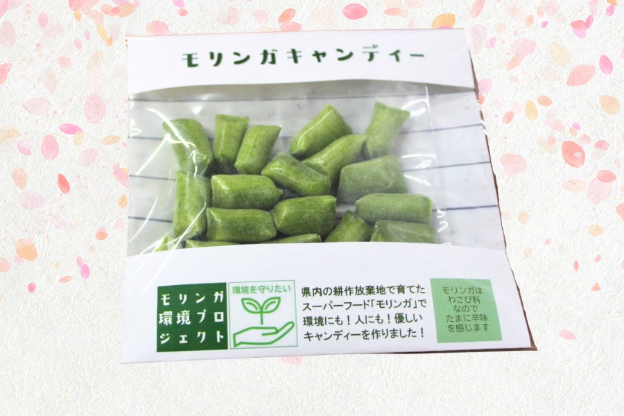 「県内の耕作放棄地を利活用して栽培されるスーパーフード『モリンガ』を飴にしました。サクサクと食べられる昔懐かしい食感で心にも体にも優しいキャンディーです。 」
