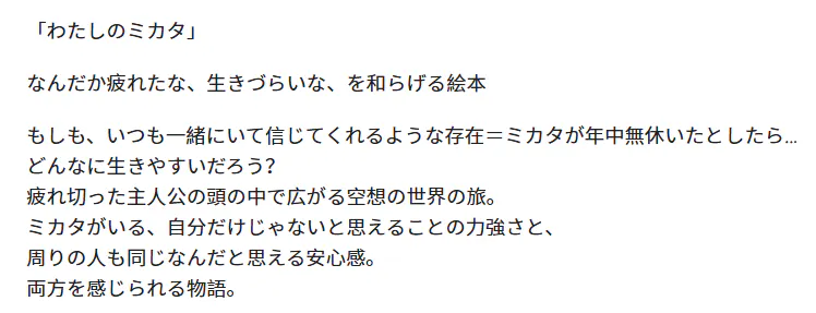 今回、「わたしのミカタ」のイラストでは「自分へのいたわりとやさしさ」を柔らかな色合いで表現しました。ページをめくるたびに心の奥にあたたかな灯がともるような、そんな気持ちになっていただけたら嬉しいです。読み終わった後、安心感に包まれたお守りのような絵本が、多くの人に寄り添い、心に届くことを願っています。