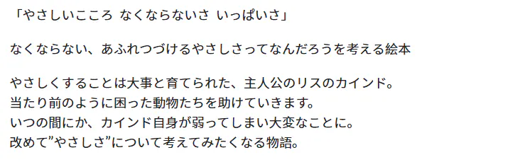 そんなシーンから生まれたこの絵本は、「自分に優しくするってどういうこと?なくならない優しさって何だろう?」というのを主人公のリス カインドと一緒に探求する物語です。