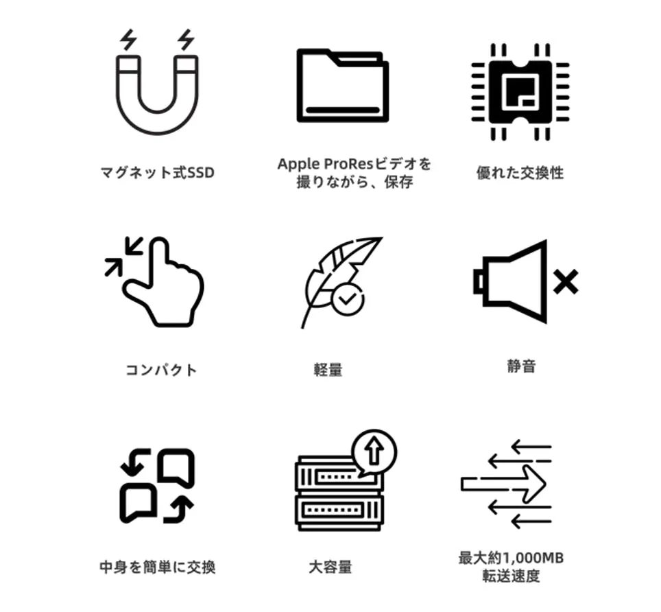 Q:アンドロイドのスマートフォンを使用していますが、対応できますか。A:外部ストレージとしての使用可能です。高速データ書き込みが可能ですので、高解像度の動画などバックアップする際も時間がかかりません。ProRes画像を撮りながらUSB-Cポートで直接データ記録をする機能は、iPhone15 Pro, iPhone15 Pro Maxの仕様ですので、現時点では、アンドロイドスマホでのご使用はできません。※ 全ての機器、OSバージョン、アプリケーション等との完全な互換性を保証するものではありません。