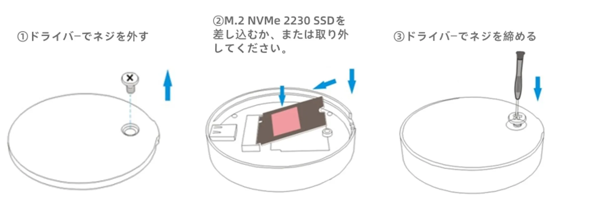 ドライバーで簡単にケースを開けることができます。対応するM.2 NVMe 2230 SSDであれば、ご自身で中身を交換することも可能です。
