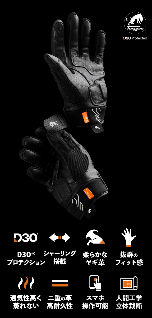 世界46か国に展開し、フランス軍やモータースポーツ等でも活躍している、歴史と実績のあるフランスメーカーFurygan(フリュガン)が特殊素材であるD3O®を搭載したオートバイ用グローブを開発。フィット感のある装着感と、高いプロテクション性能を両立させました。