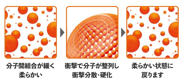 D3O®は「知的衝撃吸収材」と呼ばれる、分子テクノロジーを駆使した特殊素材です。普段はしなやかに柔らかく、衝撃時には分子結合によりエネルギーを吸収し、人体を守ります。