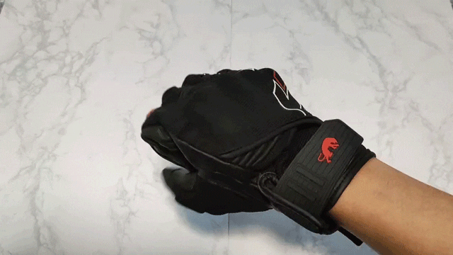 指の付け根の部分にシャーリング加工(蛇腹の部分)を施し、グリップ時に指の箇所がつっぱらないように設計しています。