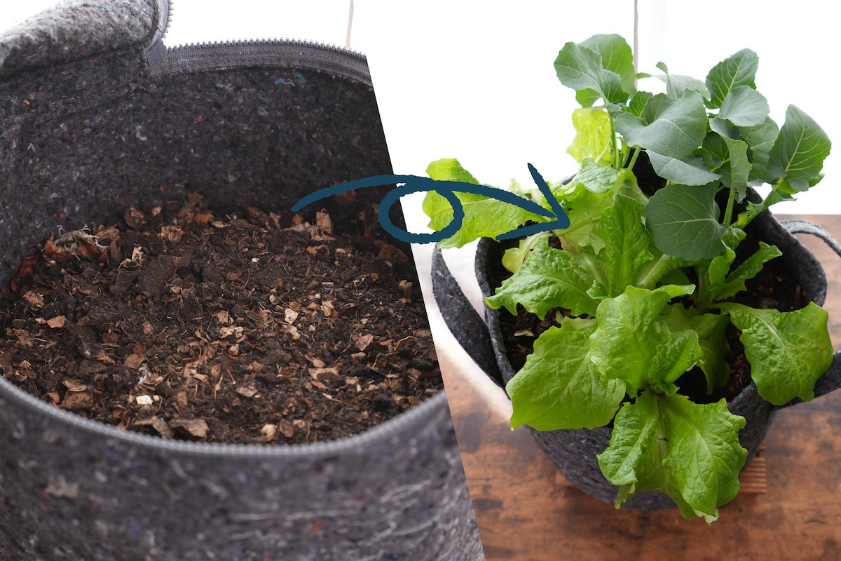 反毛(布を繊維まで分解しリサイクルしたもの)を利用した布を利用した家庭菜園ポットと野菜の種のキットです。コンポストでできた堆肥に土を加えて家庭菜園が楽しめます。(土はホームセンターなどで、ご用意ください。)