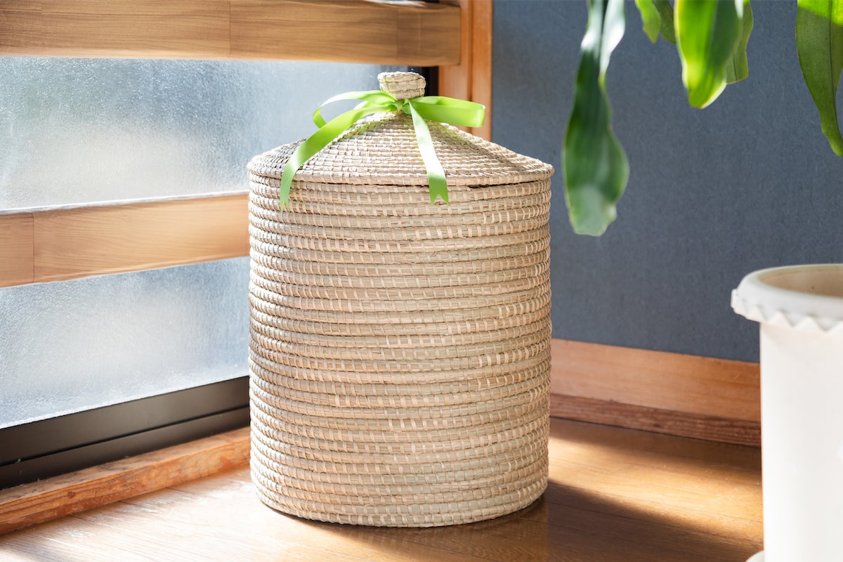 室内用コンポストの外かごは、ベトナムの水草シーグラスを使用しています。シーグラスは、日本の畳に使われているイグサに似た素朴な風合い・においを持つ水草です。ベトナムでは、伝統的に生活用品の材料として利用されており、サスティナブルな素材です。愛知県蒲郡市の株式会社VOM Craftさんに生産していただいています。