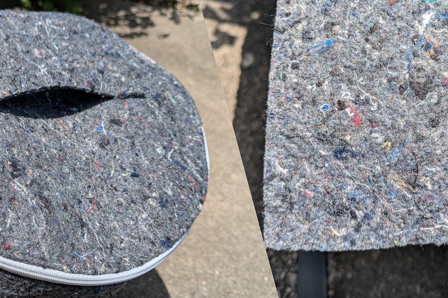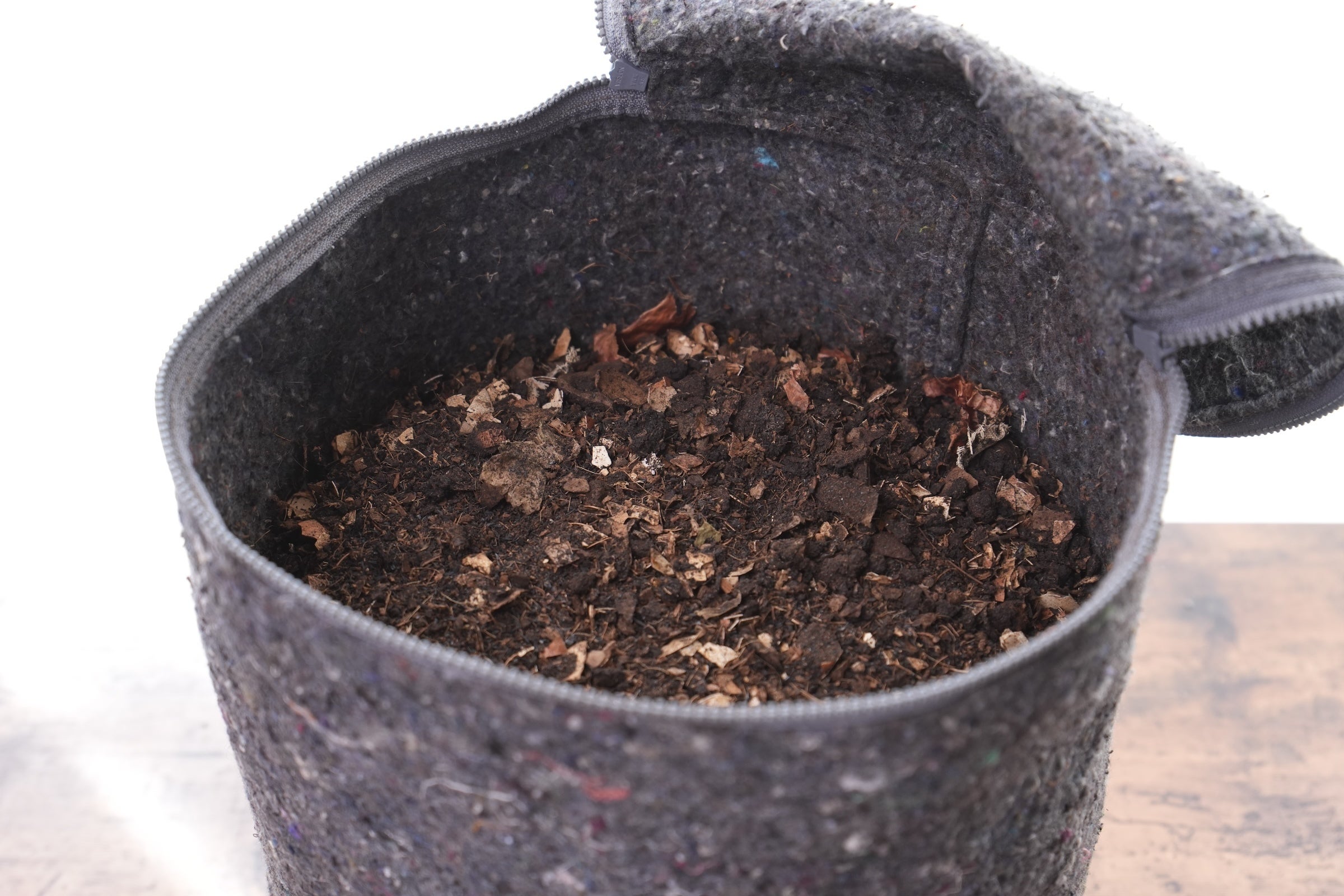 室内用コンポストの内側容器は、リサイクル素材のRe®️:FELTを使っています。これは名古屋市の瀧定名古屋(株)婦人服地82課が取り扱っている、反毛された原料から作られるフェルトです。古着や不要な布を反毛機と言われる特殊な機械でバラバラにし、わた状にしたものをもう一度布(フェルト)に再生します。通気性・丈夫さからコンポスペットの内バック、家庭菜園かごの素材として使わせていただきました。