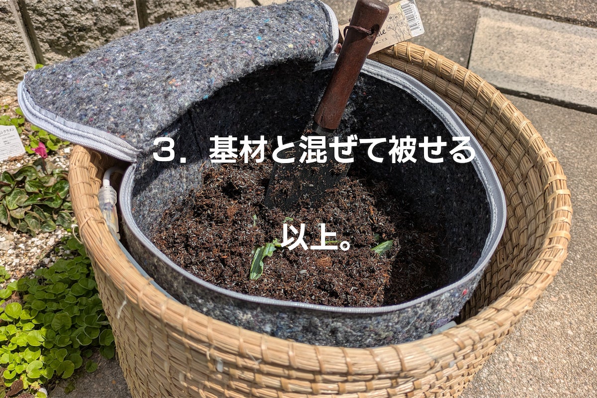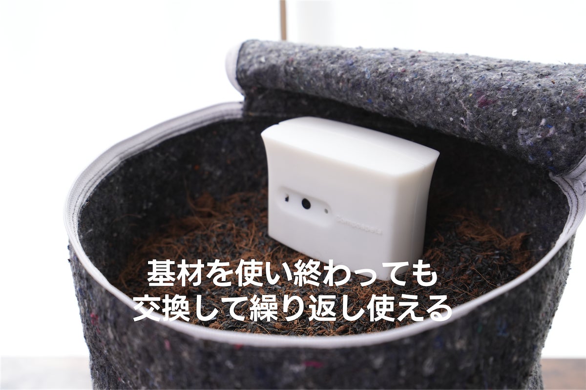 コンポストのベースの基材には、ヤシの実の繊維ココピートともみがらくん炭を混ぜたサスティナブルなもので、水分量と通気性のバランスが取れたものになっています。そこに島本微生物工業株式会社さん特製のコンポスト微生物を加味しているコンポスペットスペシャル基材です。
