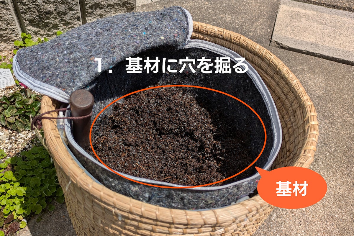 コンポスペットのコンポストはキットとなっており、すぐに始められるようになっています。キットには、基材というコンポストのベースとなるものが入っています。使い方はとても簡単です。一番最初に基材に水を入れます。あとは穴を掘って生ごみを入れるだけです。