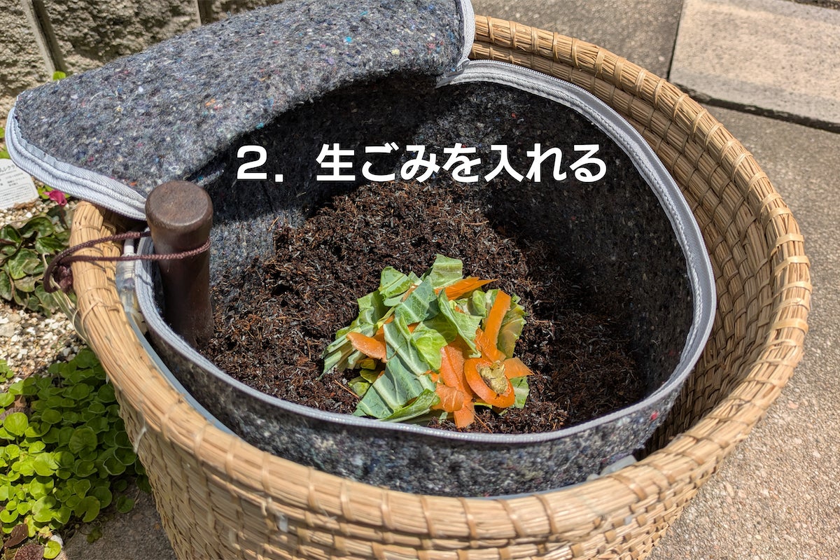 生ごみを基材に入れてかき混ぜます。微生物が日々分解していきます。2〜3ヶ月ほどで量が増えてきた、または分解が遅くなってきたら投入をやめます。その後、1ヶ月ほど寝かせると堆肥として利用できます。基材を交換、または追加購入することで継続利用が可能です。