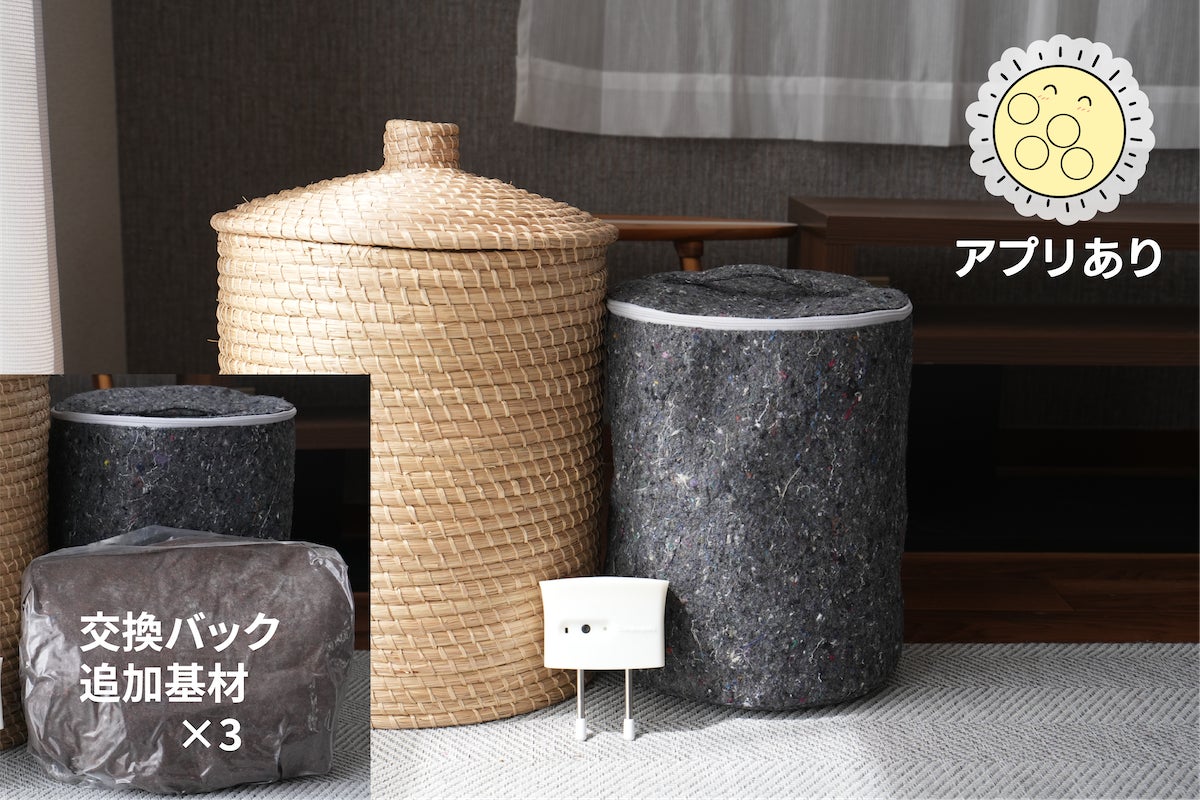 1年間継続できるように、交換用の基材が3セット、さらに室内用コンポストの交換内バックを1個付属しているキットを用意しました。