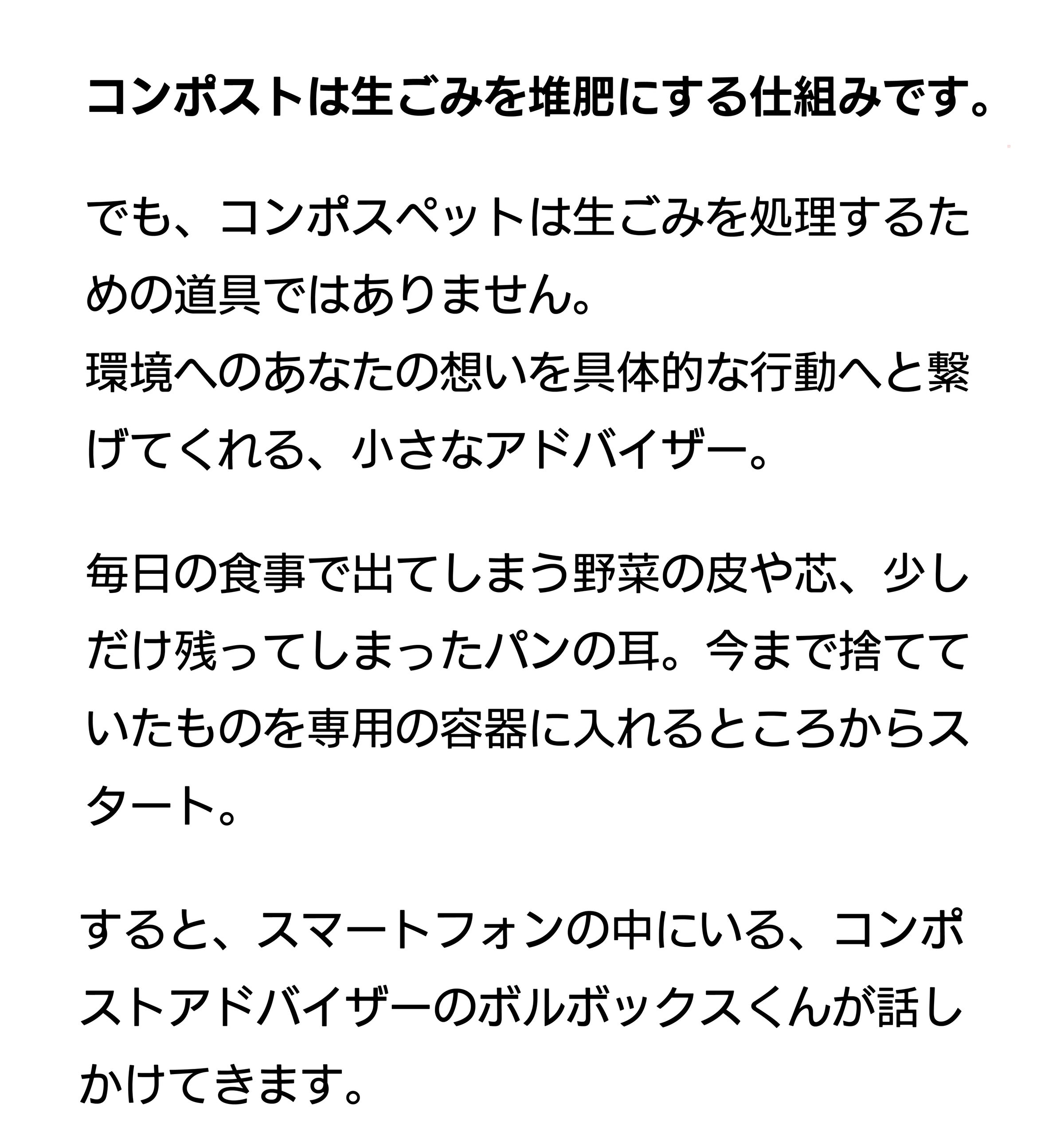 コンポストは、まだ認知度が低く、実際に使ってもらうためのハードルを下げる必要があります。もっとわかりやすく、楽しめるコンポスト。その一つとしてコンポスペットをつくりました。全てをこれで解決できるわけではありません。しかし、「新たな選択肢としてデジタルコンポストを提案したいのです」