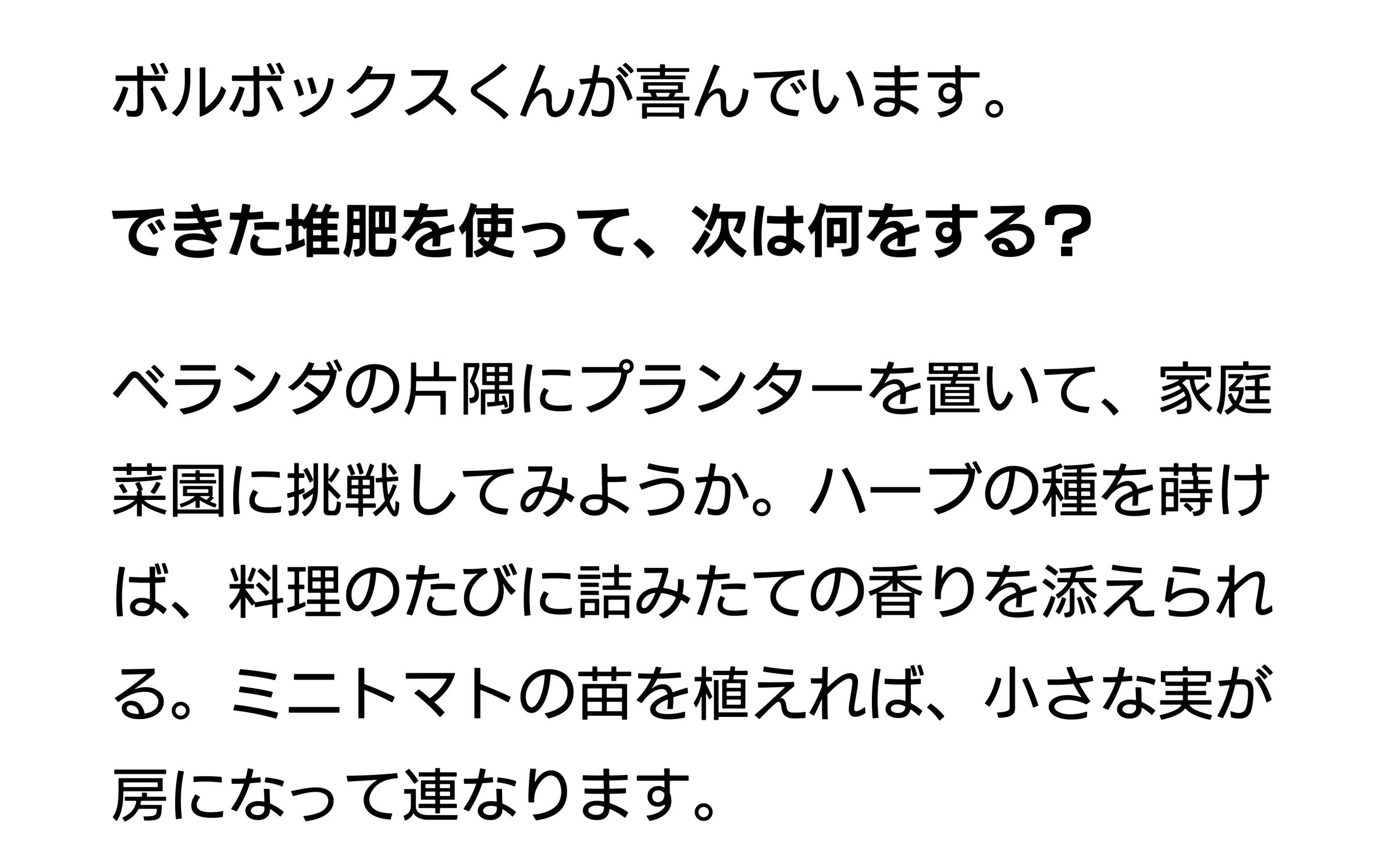 また「子どもとたちにコンポストを楽しんでもらいたい」と思っています。コンポストは家庭でできる環境の学びにつながります。楽しみながら生ごみを埋め、かき混ぜながら微生物が分解する不思議を体験してもらいたい。できた堆肥で家庭菜園を始めれば、食べるものを育てる楽しさも味わえます。