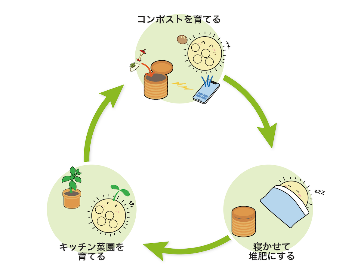 毎日、デジタルペットと一緒にコンポストを育て、できた堆肥でキッチン菜園・家庭菜園を育てて、料理に使ってその料理の野菜の残りをコンポストに入れていく。これが家庭の中でできる「小さな循環」です。