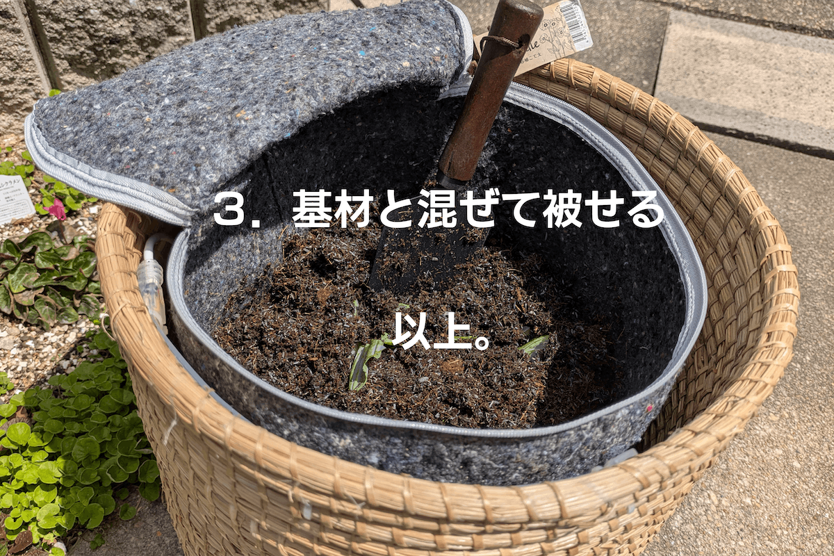 生ごみを基材に入れてかき混ぜます。微生物が日々分解していきます。2〜3ヶ月ほどで量が増えてきた、または分解が遅くなってきたら投入をやめます。その後、1ヶ月ほど寝かせると堆肥として利用できます。基材を交換、または追加購入することで継続利用が可能です。