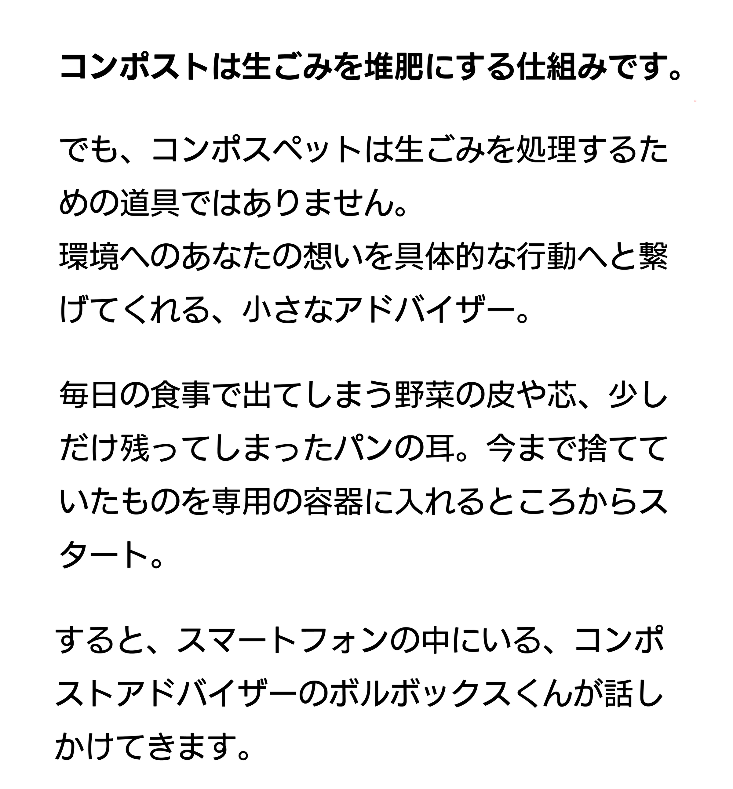 コンポストは、まだ認知度が低く、実際に使ってもらうためのハードルを下げる必要があります。もっとわかりやすく、楽しめるコンポスト。その一つとしてコンポスペットをつくりました。全てをこれで解決できるわけではありません。しかし、「新たな選択肢としてデジタルコンポストを提案したいのです」