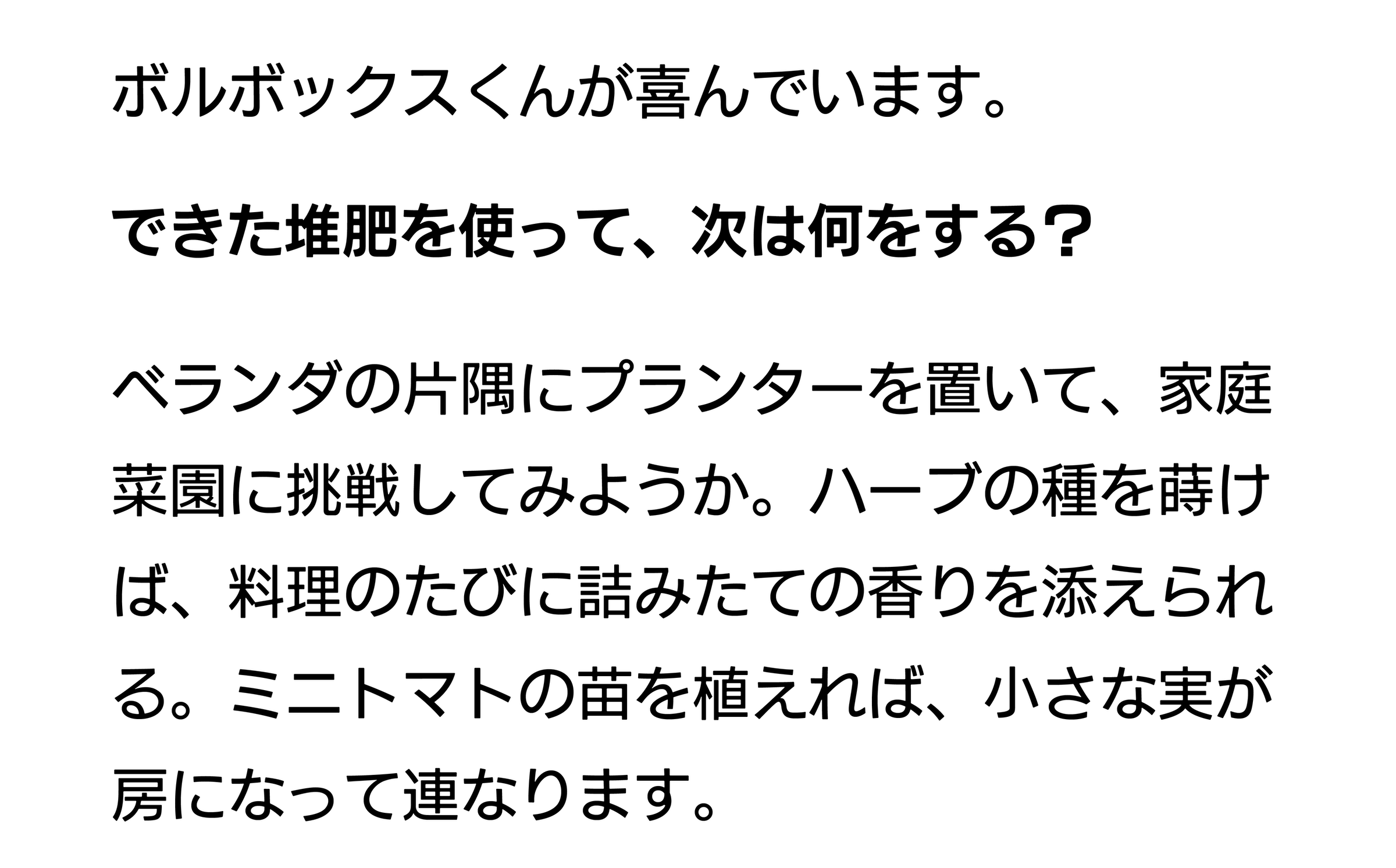 また「子どもとたちにコンポストを楽しんでもらいたい」と思っています。コンポストは家庭でできる環境の学びにつながります。楽しみながら生ごみを埋め、かき混ぜながら微生物が分解する不思議を体験してもらいたい。できた堆肥で家庭菜園を始めれば、食べるものを育てる楽しさも味わえます。