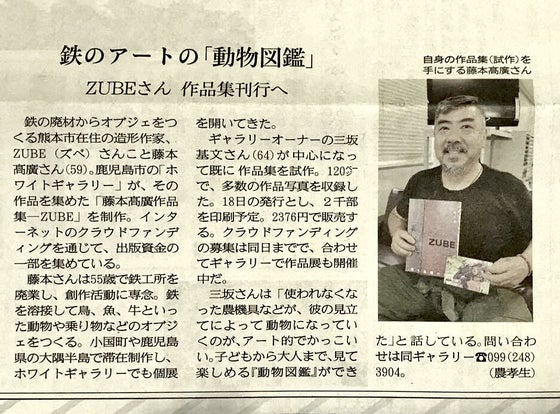 本日の熊日新聞に掲載していただきました! 18日の発行とありますが、ホワイトギャラリーでの展示とクラウドファンディングの終了日が7月18日です。 本の発行は8月中旬〜下旬の予定です。 どうぞよろしくお願い致します。 クラウドファンディングも折り返して残り12日間となりました。 引き続きの、応援、ご支援宜しくお願い致します!