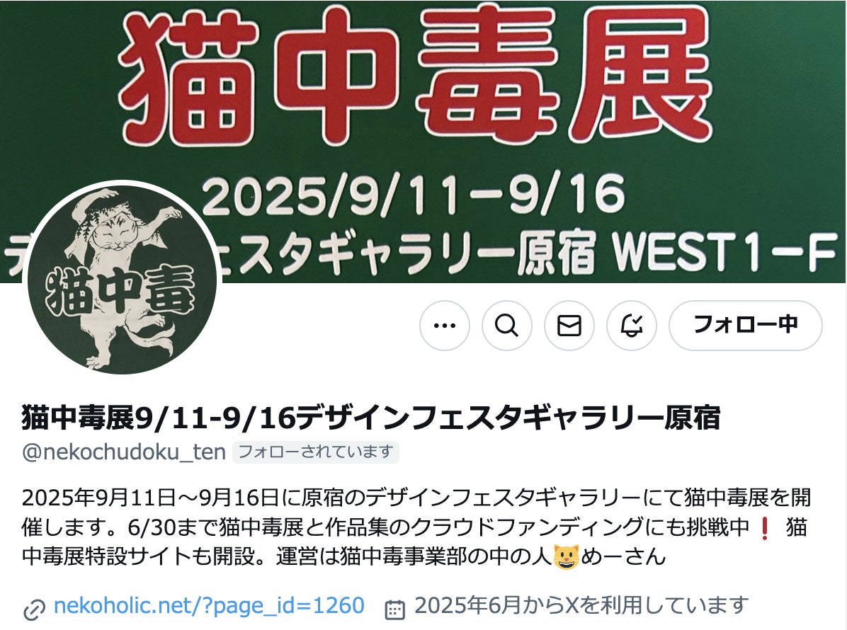 猫中毒です。いつもありがとうございます。突然ではありますが、『猫中毒展の特設サイトと現在挑戦中クラウドファンディング【猫愛たっぷりTシャツ】猫中毒を後世に伝えたい『猫中毒展』と作品集の支援募集! 専用』のXアカウントを開設しました。猫中毒アカウントでは間に合わなくなってきたのです^^; すみません。。。『猫中毒展9/11-9/16デザインフェスタギャラリー原宿』アカウントも是非フォローしてくださいね。https://x.com/nekochudoku_tenよろしくお願いいたします。