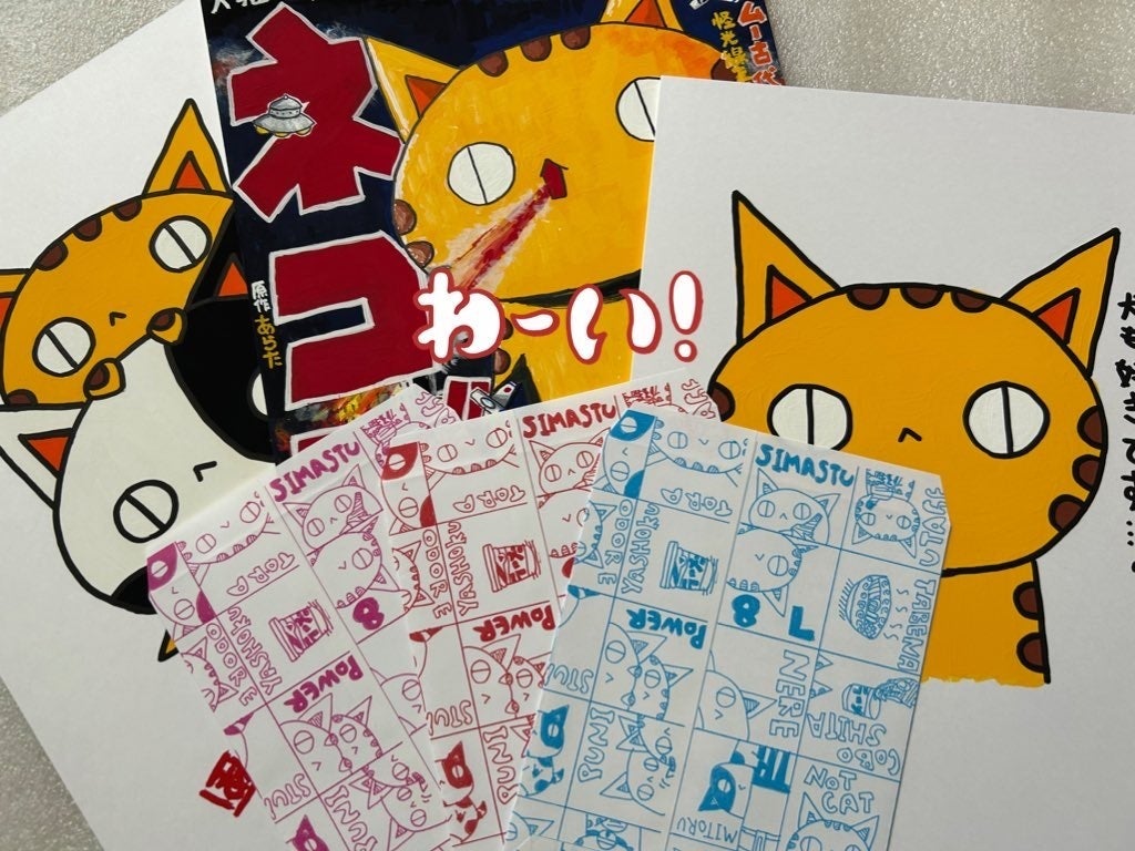富山の猫絵師あらたさんから、リターン品のオリジナルポスカイラスト(左側2つ)完成品到着しました。(プロフィールボードとオリジナル袋も同時着です)猫中毒展では原画も公開いたします。プロフィールボードは『まるっと猫中毒の本(仮タイトル)』にて掲載、原画は猫中毒展にて公開いたします。オリジナル袋はサンプルで試しに作ってみたものだそうです。昭和っぽい包装紙がつくれると良いかなという構想が(笑)少しずつですが、着々と進行中です。↓最終ちょっと前の途中経過です。ご支援をお願いいたします。