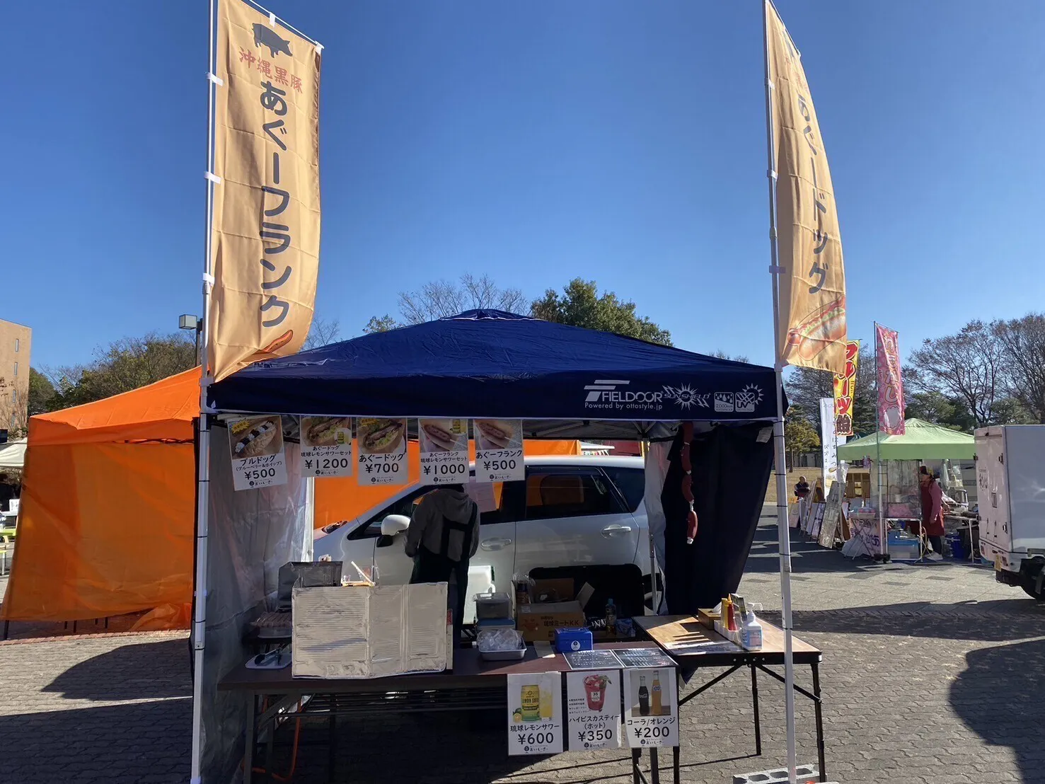 屋外のイベントでは妻の地元沖縄の精肉会社より直送で仕入れたブランド黒豚あぐーのソーセージを使ったフランクフルト&ホットドッグ、当園ブルーベリーを使用したジュースなどを販売し農園・沖縄のPR活動をしています。