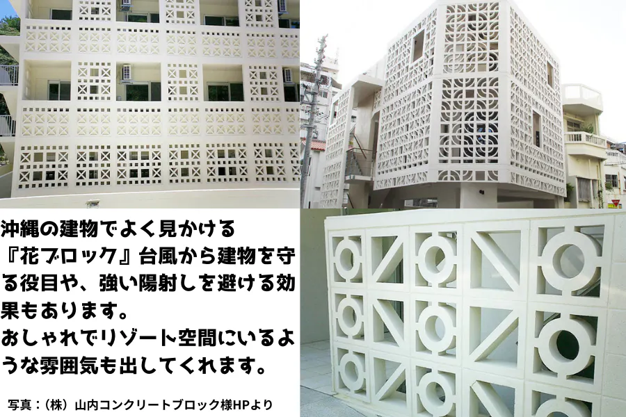 下記の写真は沖縄のホテルや住居、テラスなどでよく見かける『花ブロック』