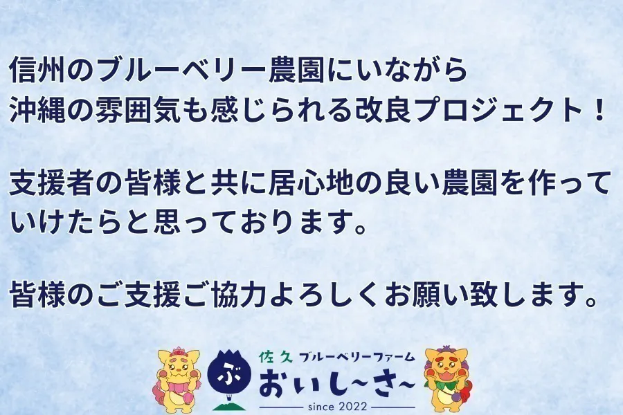 当園とお客様が一体となって『佐久ブルーベリーファームおいし~さ~』を成長して行けたらと考えております。