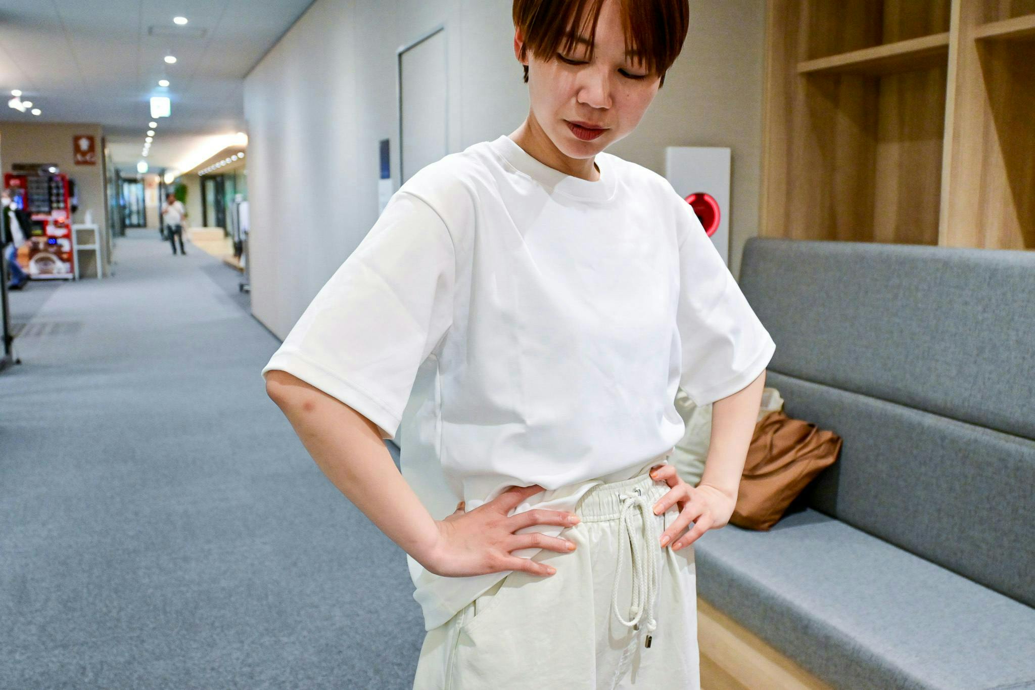 ゆったりオーバーサイズで、袖は五分丈に。生地がしっかりしているので、リラックス感がありながらもラフになりすぎない、良いバランスだと思います。
