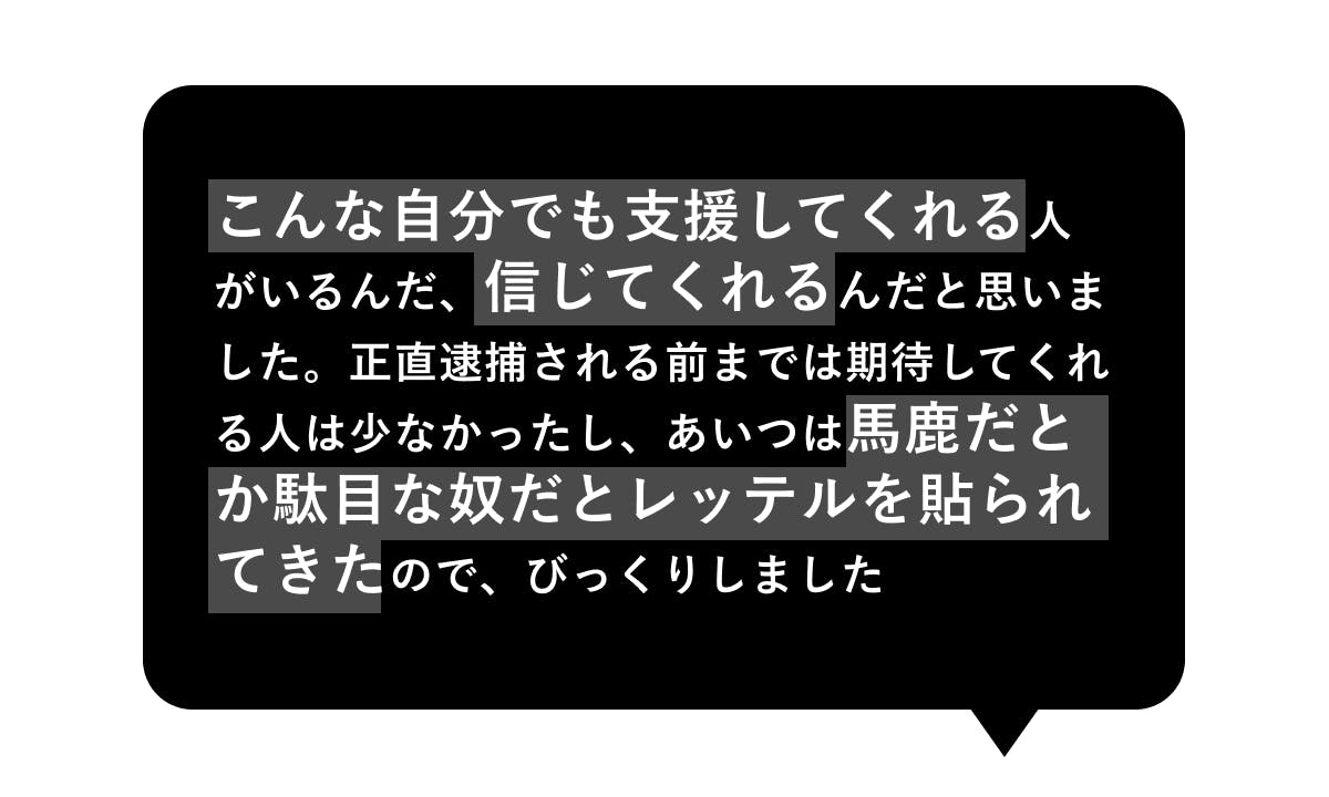 少年院に送られると聞かされた時、「人生終わった」と感じる子が多いと思います。でも、少年たちの現状を知れば知るほど、彼らが夢や目標を捨ててひっそりと生きていかなければいけないとは、僕には思えませんでした。自分のしたことを受け止めて、今度は人を助けたり、社会を良くする仕事をする人になれると信じたい。いい環境や出会いがあれば、彼・彼女たちの未来は絶対に変わります。