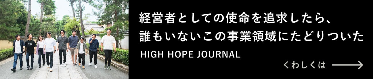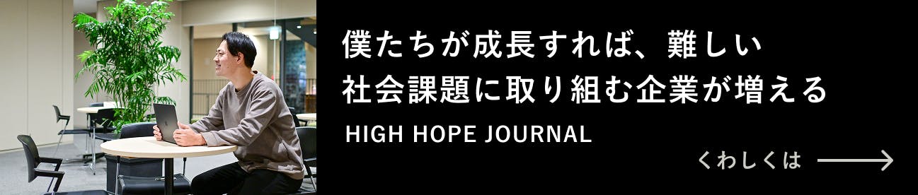 僕たちは、HIGH HOPEの成長が、次世代の社会起業家が活躍できるフィールドを広げることにつながると考えています。お金にならないという理由で課題解決をあきらめる人が減り、経済性と社会性を両立する起業家が各分野で増えていけば、社会は必ずよくなります。