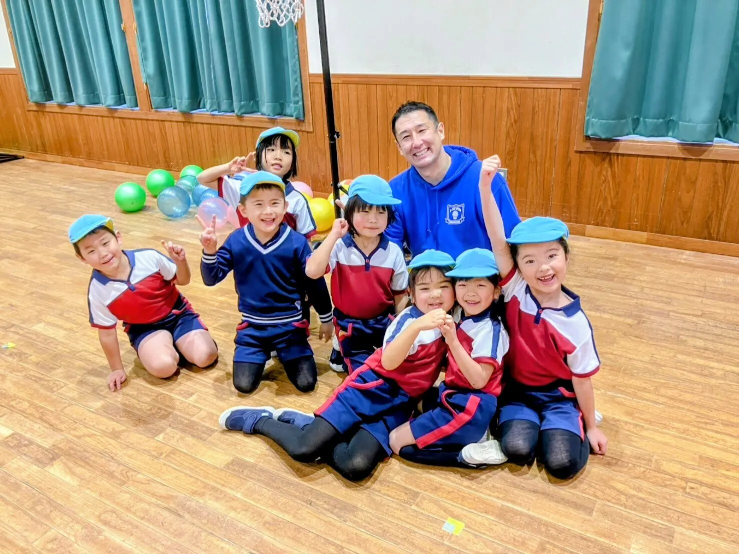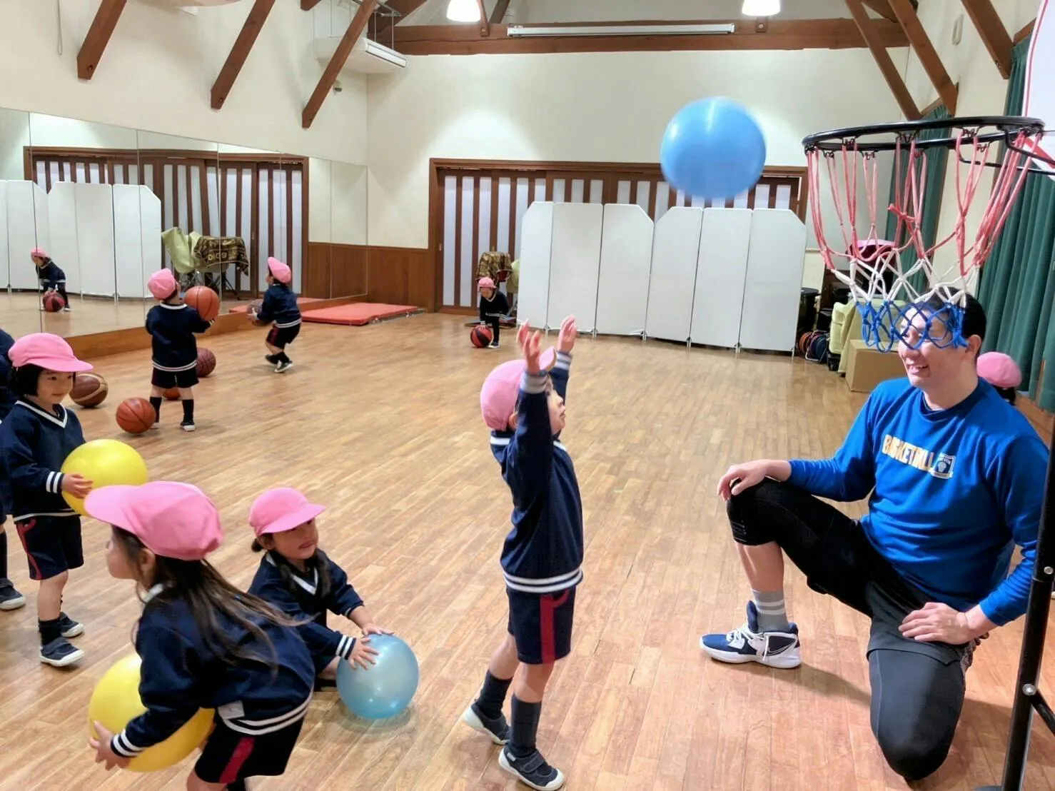 行ってみると、大きな体育館に、さまざまなボールや道具が用意され、だいちゃんは体育館の端っこで、子どもたちをじっと見守ってくれていました。