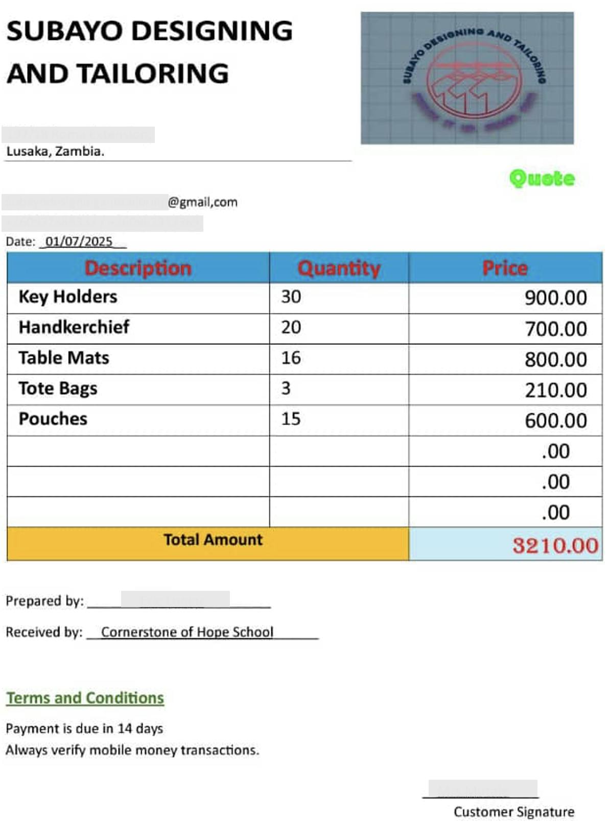 最終的な取引価格は、現地のテーラーさん及び仲介してくださった中高等学校の責任者の方の確認のもと、以下の書類をもって正式に決定されました。