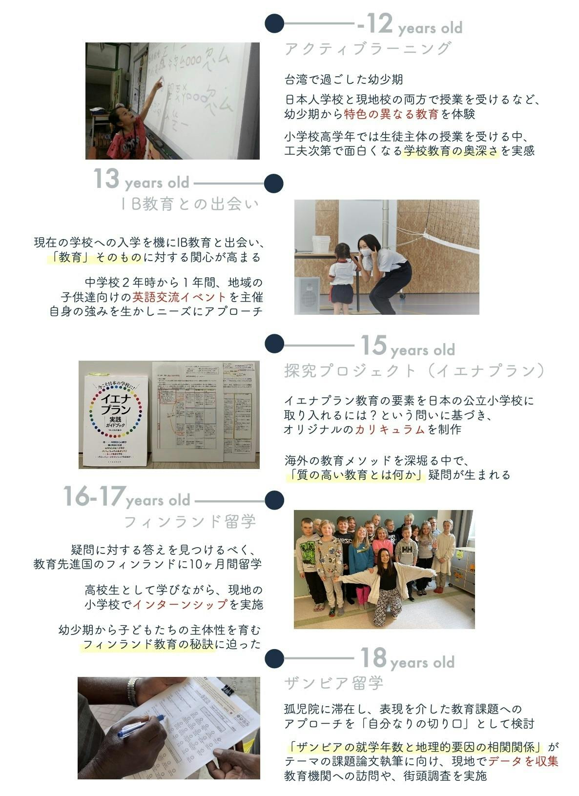 その後、学校のプロジェクトの一環で探究活動に取り組んだり、IB生として国際バカロレア教育の奥深さを実感したりする中で、私は世界各地で実践されている教育のユニークさに、徐々に惹かれるようになっていきました。