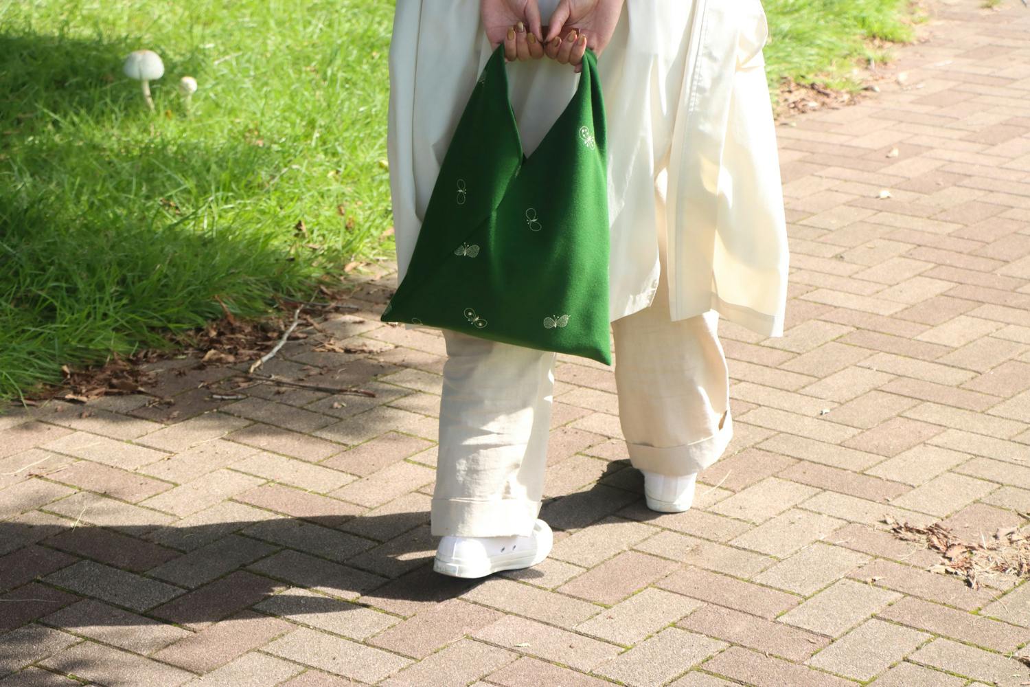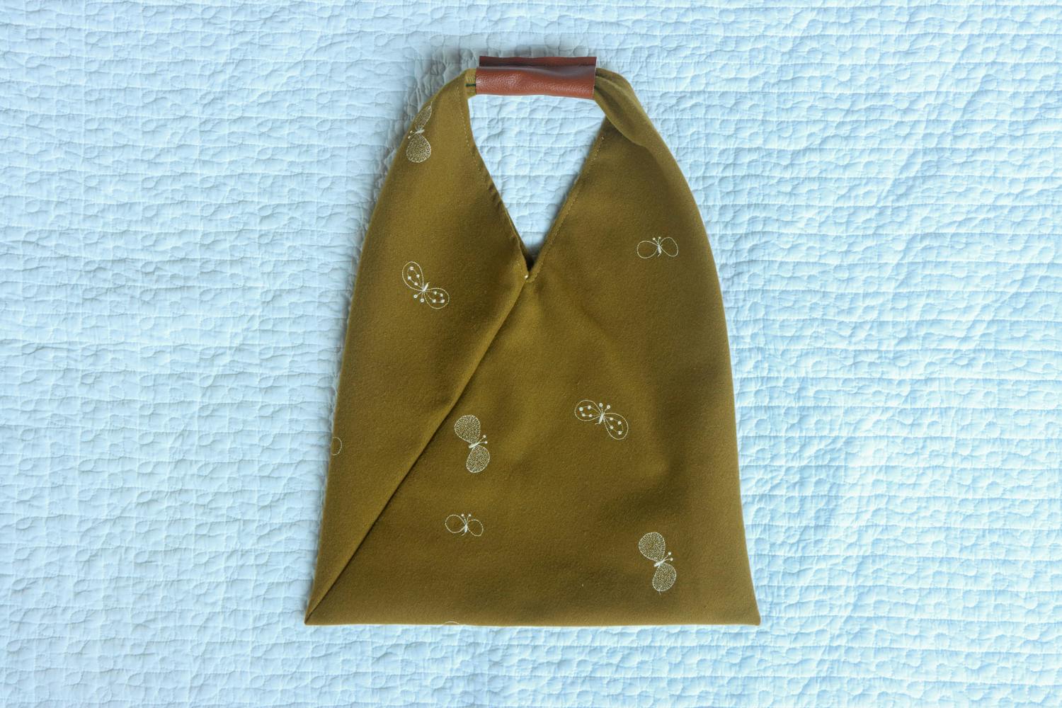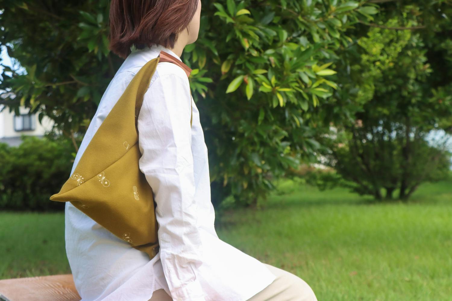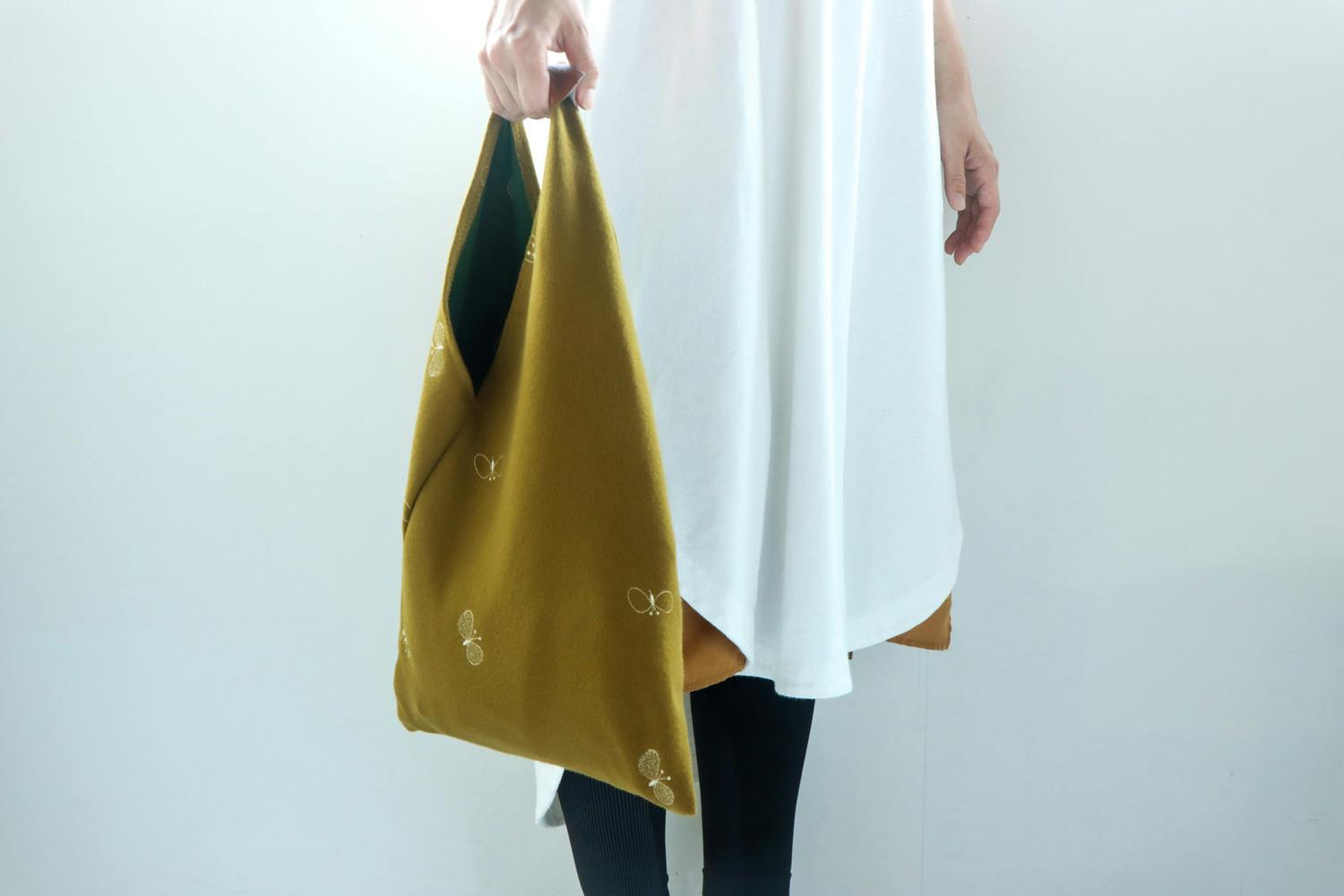 人気テキスタイルブランド「ミナ ペルホネン」の代表的なテキスタイル「tambourine(タンバリン)とchoucho(チョウチョ)」柄を使用した、三島家具オリジナル。ファッションのワンポイントとしてオシャレな"あずま袋"になりました。